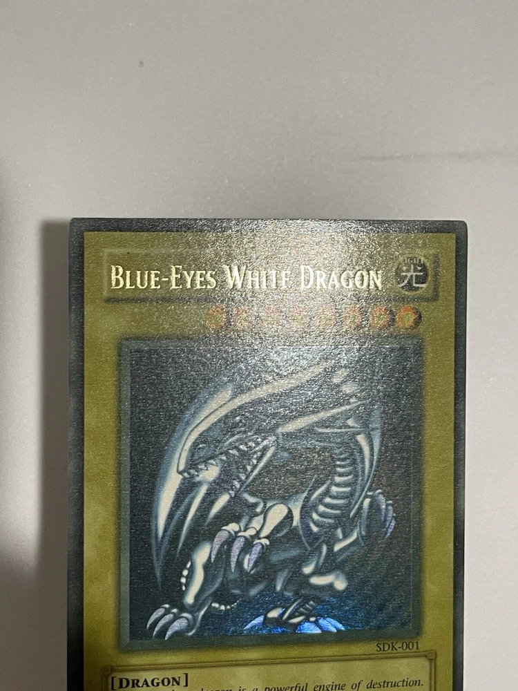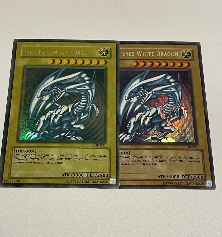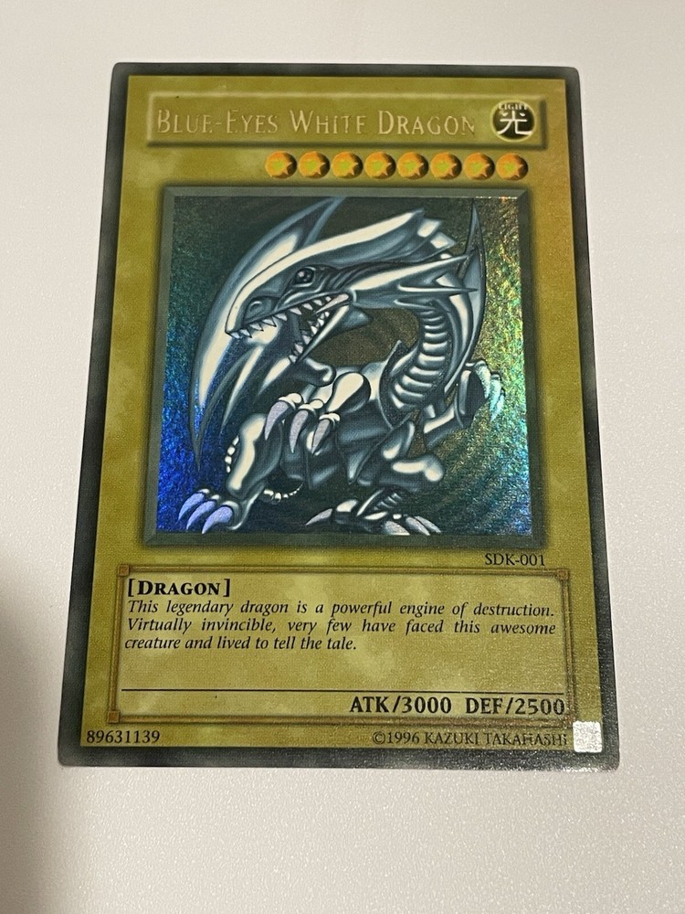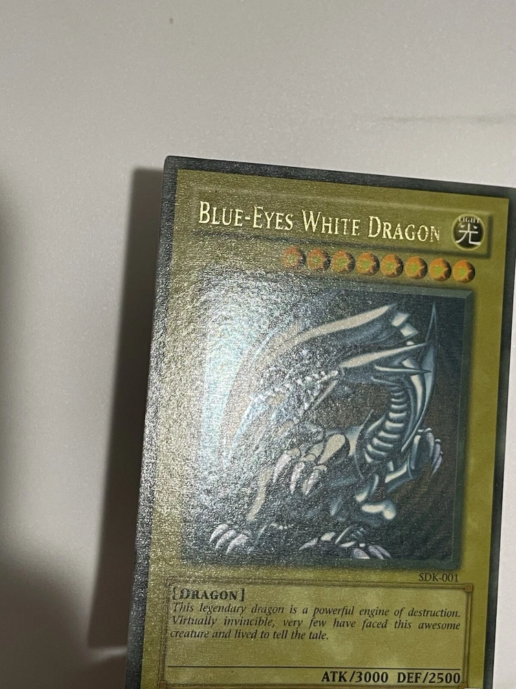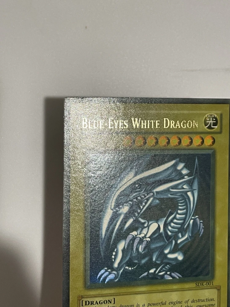The Yu-Gi-Oh! 2002 Blue-Eyes White Dragon SDK-001 card is a monster card with an attack power of 3000 and a defense toughness of 2500. It is an ultra rare card with a holographic finish and belongs to the Seto Kaiba set. The card is in English language and has a standard size. The card is manufactured by Konami and has a light color. It is a collectible card game individual card with an unlimited feature. Second saturated card in the pictures is not for sale and won’t be included with the titled card, used for demonstration purposes only.