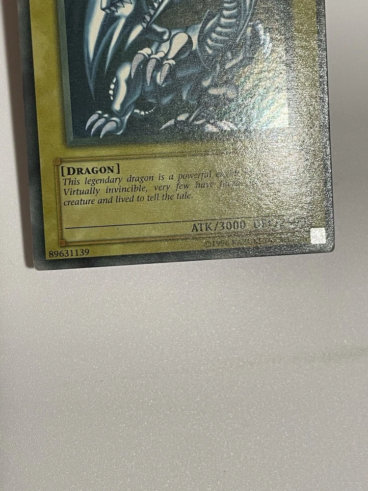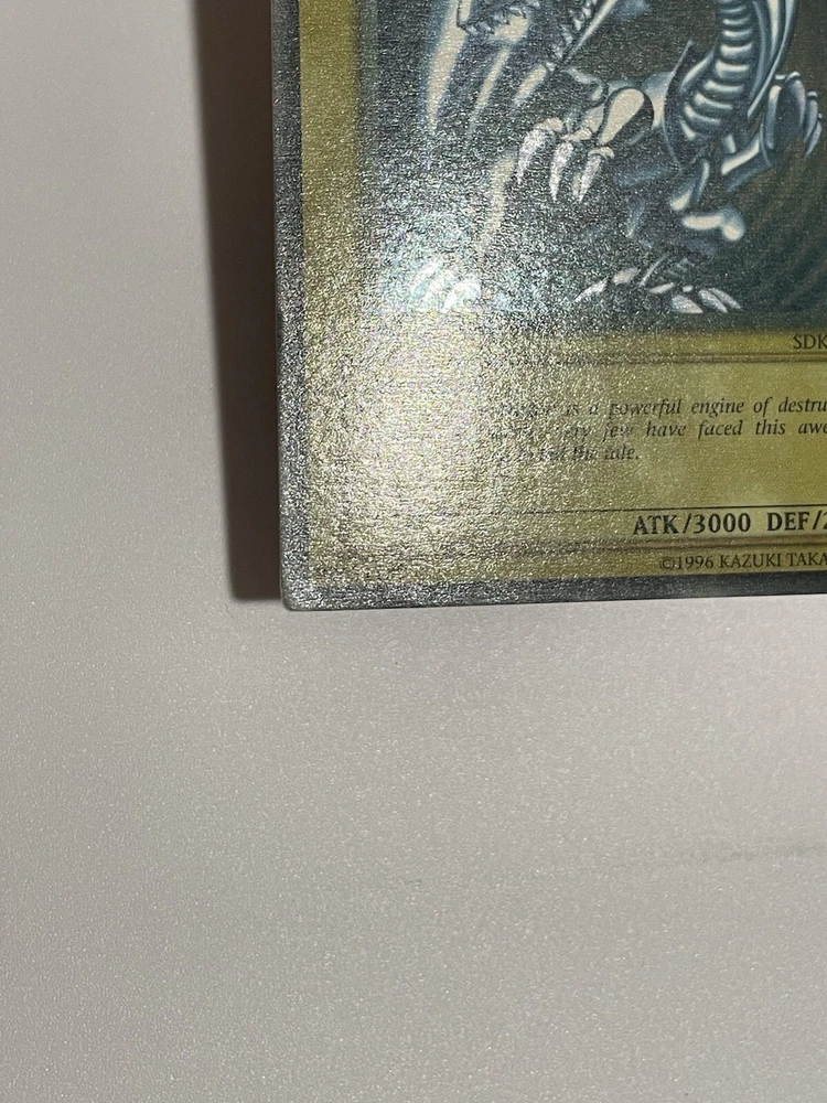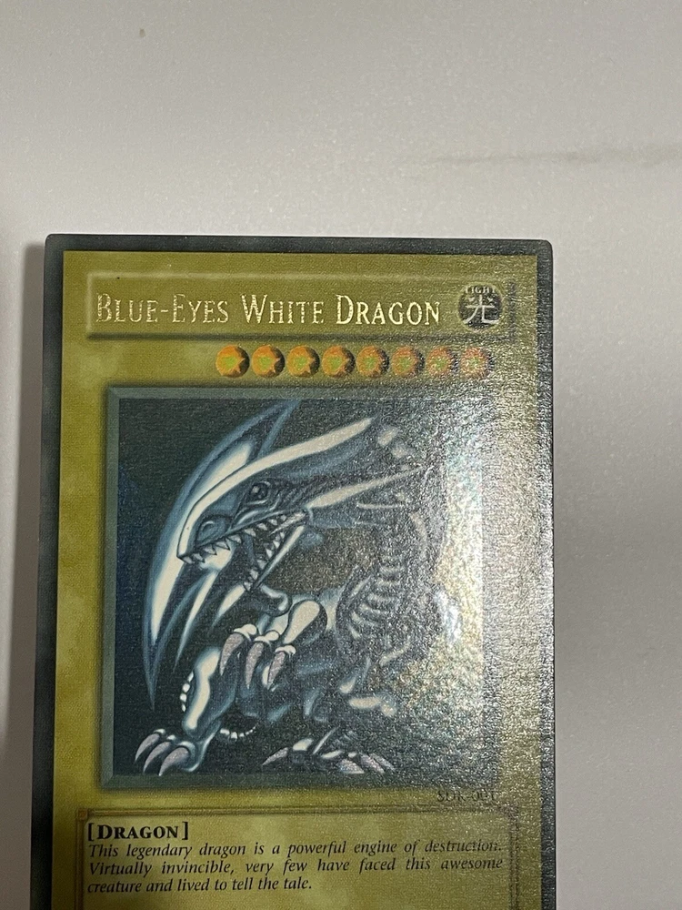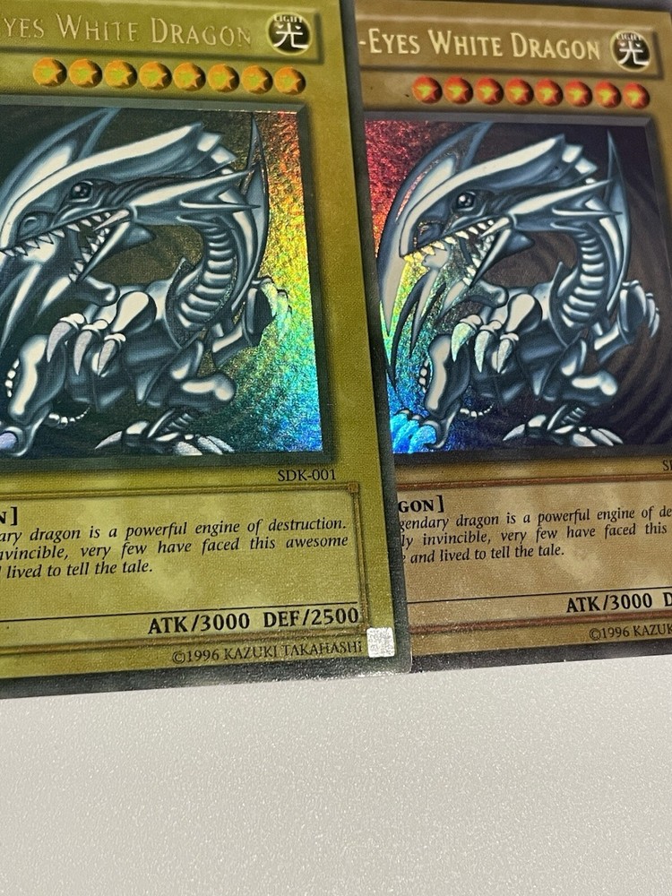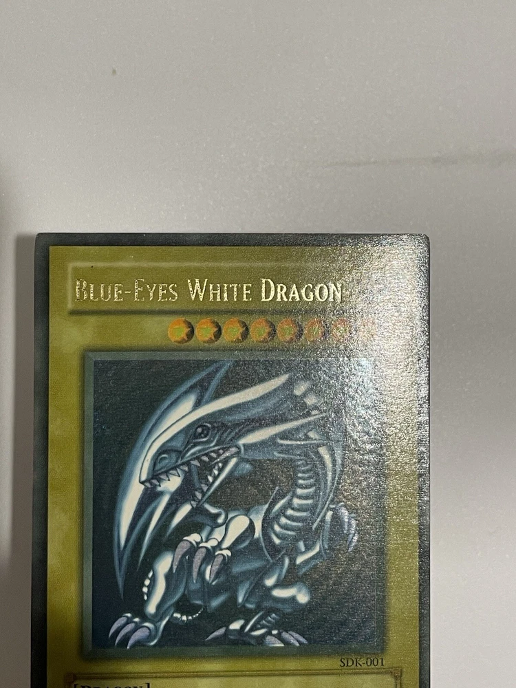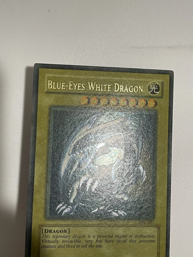 The Yu-Gi-Oh! 2002 Blue-Eyes White Dragon SDK-001 card is a monster card with an attack power of 3000 and a defense toughness of 2500. It is an ultra rare card with a holographic finish and belongs to the Seto Kaiba set. The card is in English language and has a standard size. The card is manufactured by Konami and has a light color. It is a collectible card game individual card with an unlimited feature. Second saturated card in the pictures is not for sale and won’t be included with the titled card, used for demonstration purposes only.