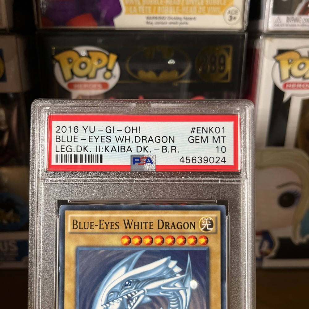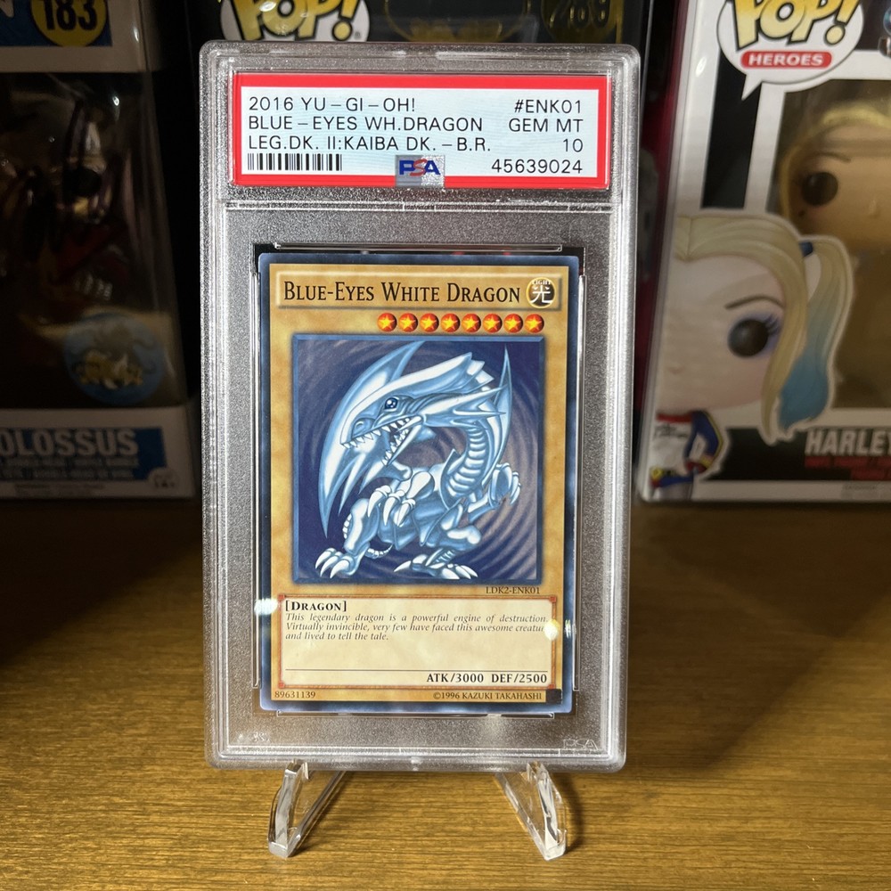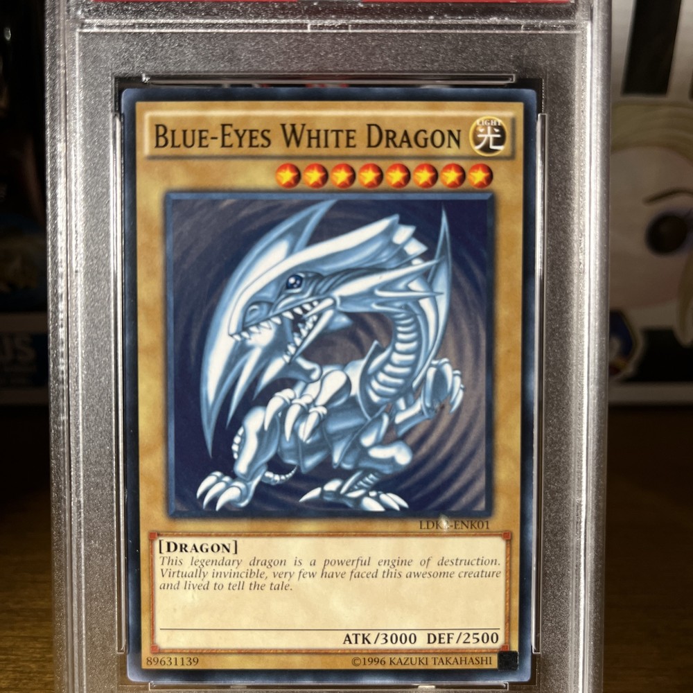 This rare and powerful Yu-Gi-Oh! TCG card features the legendary Blue-Eyes White Dragon from the Yugi set. With an attribute of Light and a creature/monster type of Ancient Dragon, this card is a must-have for any collector or player. Manufactured by Konami in 2016, this limited edition card has a regular finish and is in PSA 10 condition with a population of 19. The card number is LDK2-ENK01 and it is not autographed. Perfect for any fan of the collectible card game, this Blue-Eyes White Dragon card is a great addition to any collection. Don't miss out on the opportunity to own this iconic card from the Yu-Gi-Oh! TCG.