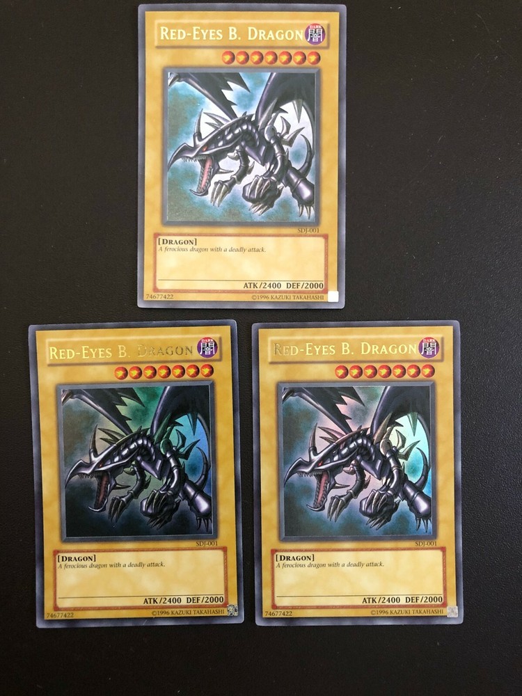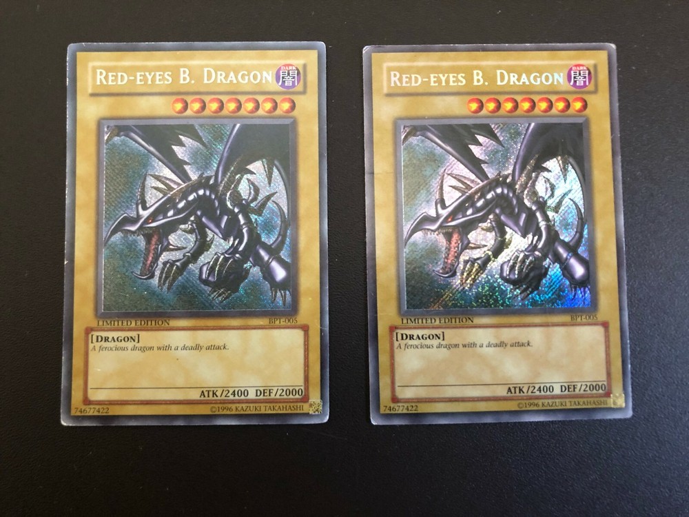 Skip to main conten End of la YuGiOh! Red-Eyes B. Dragon Collection Here is what you are purchasing: 6x Card, exactly what you see in the picture: These cards are in Excellent to Near Mint condition These cards will be shipped in standard mailing USPS First Class with tracking number Cards include: 1x Red-Eyes B. Dragon (SDJ-001) - 1st Edition - Ultra Rare 2x Red-Eyes B. Dragon (BPT-005) - LIMITED EDITION - Secret Rare 3x Red-Eyes B. Dragon (SDJ-001) - Unlimited Edition - Ultra Rare Special Request or Listing Please contact us directly if you wish to purchase different quantity of cards that are not listed We are more than happy to list special listing upon your request International Buyer - Please contact me directly if you wish to purchase my item before purchase Shipping & Handling Info Shipped in a top loader We ship all orders within 1 business day We typically ship via USPS First Class Listed by BD Return Policy and Feedback: ALL SALES ARE FINAL. SOLD AS IS. No refunds will be issued for this auction. If you are unsatisfied by your order, please contact us and we will work with you to resolve it to your satisfaction.