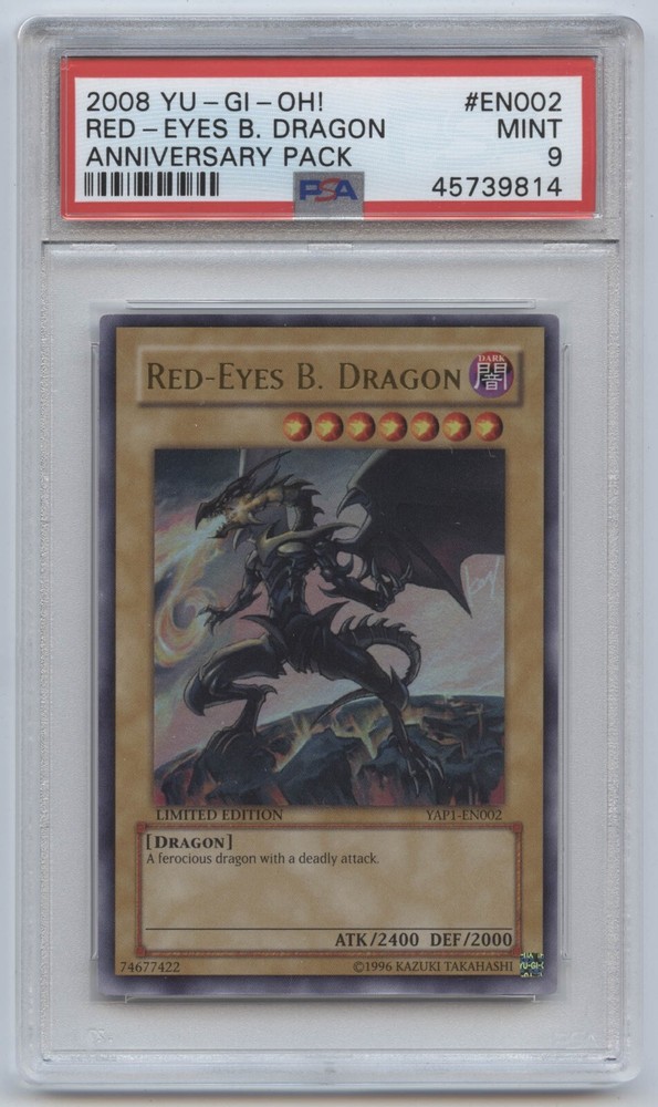 This listing is for one Ultra Rare Red-Eyes B. Dragon (YAP1-EN002) from the Yu-Gi-Oh! Anniversary Pack 1. This card is graded PSA 9 MINT. Purchase with confidence from coretcgcollectibles, a trusted e B a y seller with over 20,000 positive feedback. Item Description You will receive the item listed above. Please take a look at our other auctions for great deals and combine shipping! Shipping Options Domestic Shipping Options (United States Only) USPS First Class w/Tracking (3-5 Days): $3.99 USPS Priority Mail w/Tracking (2-5 Days): $6.99 USPS Priority Mail Express w/ Tracking (1-2 Days): $24.99 International Buyers - All orders are shipped using eBay's Global Shipping Program. We do not combine shipping for international order. Please Note: Import duties, taxes, and charges are not included in the item price or shipping cost. These charges are the buyer's responsibility. Please check with your country's customs office to determine what these additional costs will be prior to bidding or buying. Shipping & Payment Details Combining multiple auction winnings: We combine shipping charges for multiple auctions. Payment Policy We reserve the right to remove bids if we believe that it may be harmful to other bidders. Auction winners are required to make payment in full within 7 days after the auction ends. Sales tax may apply in your area. CoreTCG 770 S Arroyo Parkway #110 Pasadena, CA 91105 Credit Cards: We accept Visa, MasterCard, American Express, and Discover Card through PayPal.