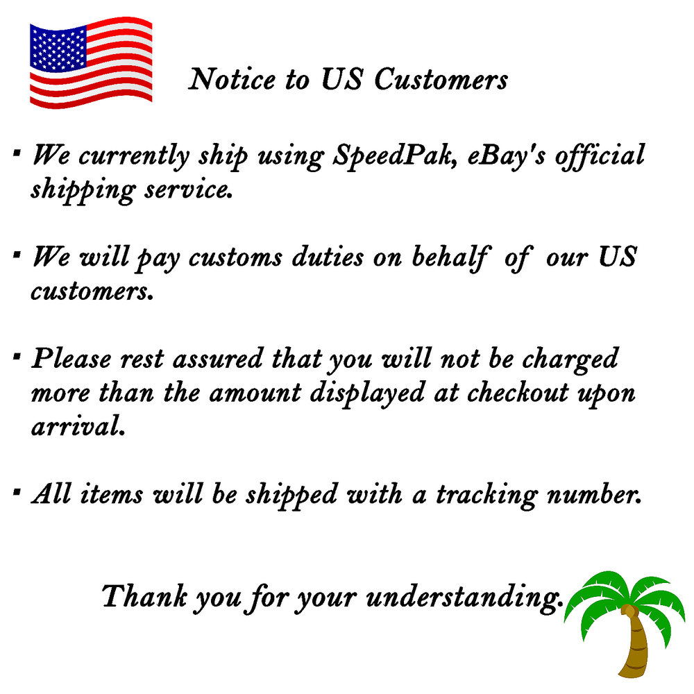 Shipping Please select at the time of payment. Economy Shipping It will be delivered by Japan Post(Air Mail). Usually it Takes 15 - 30 Days. But Sometimes it Takes About 30 - 60 Days. Standard Shipping(With Tracking Number) It will be delivered by Japan Post(Air Mail). Usually it Takes 7-14 Days. But Sometimes it Takes About 14- 21 Days. Expedited Shipping(With Tracking Number) It will be delivered by Fedex or EMS. Usually it Takes 3 - 5 Days. But Sometimes it Takes About 7 - 10 Days. Payment We accept all Payment. Please pay within 7 days after auction is finished. International Buyers Please Note Import duties, taxes and charges are not included in the item price or shipping charges. These charges are the buyer's responsibility. Please check with your country's customs office to determine what these additional costs will be prior to bidding/buying. These charges are normally collected by the delivering freight (shipping) company or when you pick the item up - do not confuse them for additional shipping charges. We do not mark merchandise values below value or mark items as "gifts" - US and international government regulations prohibit such behavior. Thank you for understanding.