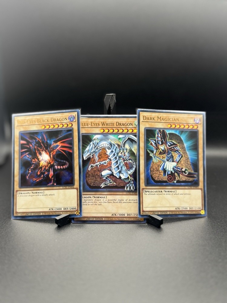 Blue-Eyes White Dragon, Dark Magician, and Red Eyes Black Dragon Ultra Rares in Near Mint condition. Card will be packaged with sleeve and toploader for best protection. If you have any questions feel free to message me and I will get back to you as soon as possible.