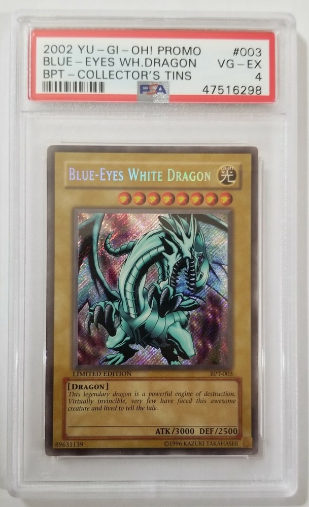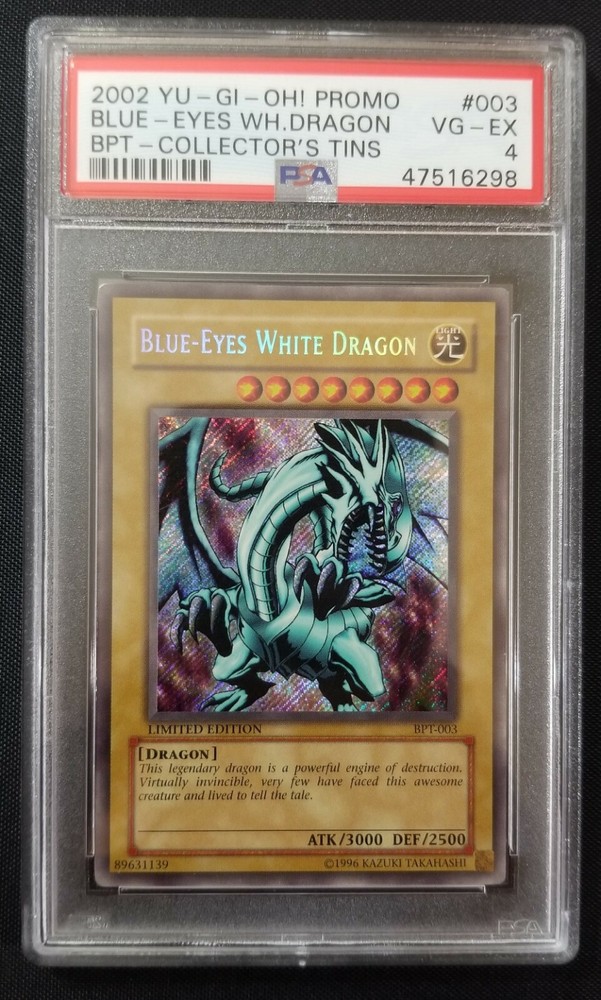 Yu-Gi-Oh! BLUE-EYES WHITE DRAGON BPT-003 Secr. Rare 2002 Collectors Tin PSA 4 🍒 Yu-Gi-Oh! BLUE-EYES WHITE DRAGON BPT-003 Secret Rare 2002 Collectors Tin PSA 4 Graded VG - EX PSA 4 Graded VG-EX (Very Good-Excellent Condition) Please examine the pictures of the actual card in this listing carefully before purchase. If you have any questions or concerns please let me know. Thank you. Important buyer options & information below. Check out my eBay store: ebay.cjbcollectibles.com for more Yu-Gi-Oh! Pokémon, Magic The Gathering, Comic Books and other collectible items. CjB Collectibles (brattyangel9494) with legendary customer service, real pictures, fast and professional shipping! Why settle for anything less? You deserve better! Our ebay store at: ebay.cjbcollectibles.com We normally try to respond to questions promptly however please allow us up to 24 hours for a response. Response time may be delayed on weekends and holidays. Thank you for your patience. eBay.CjBCollectibles.com Shipping Returns Item assesment & conditions Questions & Feedback CJB Collectibles offers Domestic and International shipping. Worldwide Shipping. Domestic (USA) customers have 2 choices of shipping at checkout: At checkout default is FREE / ECONOMY shipping. You get: Minimal protection with a standard envelope or economy mailer. Tracking may not be available. OR ***** (We Recommend) ***** $4.99 Standard / First Class shipping. You get: Premium packaging & First Class shipping. Your items will be in a secure bubble mailer or box. You will receive a tracking number. We give our customers options therefore we will not be held liable for unreliable / no tracking or damage to merchandise during delivery. We ship same business day or next business day. We hope you will love your purchase at CjB Collectibles, however if you need to return it, we have a 30 day return policy. All items must be returned in the same way as it was sent, including original sleeves, top loaders, bags, backing board, etc. If not returned exactly as it was sent then there may be fees imposed and will be reported to eBay. If you have any questions or concerns please use the "contact us" . We go above and beyond for our customers. Before contacting eBay, your bank card or payment provider, or leaving Neutral or Negative feedback please "contact us" first. Mistakes may happen but we will work with you to give you a pleasant and positive experience at CjB Collectibles. We are not professional card graders however we have many years of dealing with Graded & Non-Graded, Sports & Non-Sports cards and your opinion on condition may differ from ours. It is recommended and expected for the buyer to examine the pictures carefully to avoid condition conflicts. We are very transparent and use a high power camera with different background contrasts in our live pictures so that you may see all or most details with ease. The first 5 pictures will be flat images and if there is a hard to see detail or defect it will be shot on an angle after the 5th image for clarity. We want you to know what you are buying, yes it is important to us. We do not use stock images. If there is a condition concern or any question please be courteous and message me rather than using eBay as your first option for a resolution and I will work with you to answer or resolve it immediately. There is no need to open any claim and bring a 3rd person (eBay) when we can resolve any problem with ease. I usually respond quickly but please allow me up to 24 hours to respond as I strive for excellent customer service with a smile. Please before contacting eBay, payment provider, or leaving negative or neutral feedback, please contact me / message me with your concerns or questions and I will address it as soon as possible to resolve any issues. I usually respond promptly but please allow me up to 24 hours to respond to your concerns. I strive for excellence in customer service and your thoughts are important. Thank you. I use an automated feedback program that is set to where as soon as the buyer leaves a positive feedback the program automatically leaves you a positive feedback as well. If you do not leave feedback than you will not receive feedback. If you want to opt out for a feedback reminder please message me. If you leave feedback and you did not receive feedback than please contact me so I can manually enter the feedback for you. There will be an automated feedback reminder that after a few days if you did not leave feedback the program will send you a reminder. There is no obligation to leave feedback however, I am hoping that if I provide you with an outstanding product and service that you would be so kind and let others know via "leave feedback" . ABOUT US CjB Collectibles sells and buys all sorts of TCG's like Pokémon & Yu-Gi-Oh!, anime, comic books, toys, collectibles & more! 😁 You can enter directly from any browser by copy and paste our store link: www.ebay.cjbcollectibles.com We are based in New Jersey and have been collecting Sports and Non-Sport cards, comic books and toys since as far back as the late 70's. We run the store with family and we try to keep prices very fair and reasonable so that we can all have fun collecting and playing TCG's. I want everyone to have fun and go "gotta catch em' all" eBay listing template by 3D sellers.com - Try for Free!