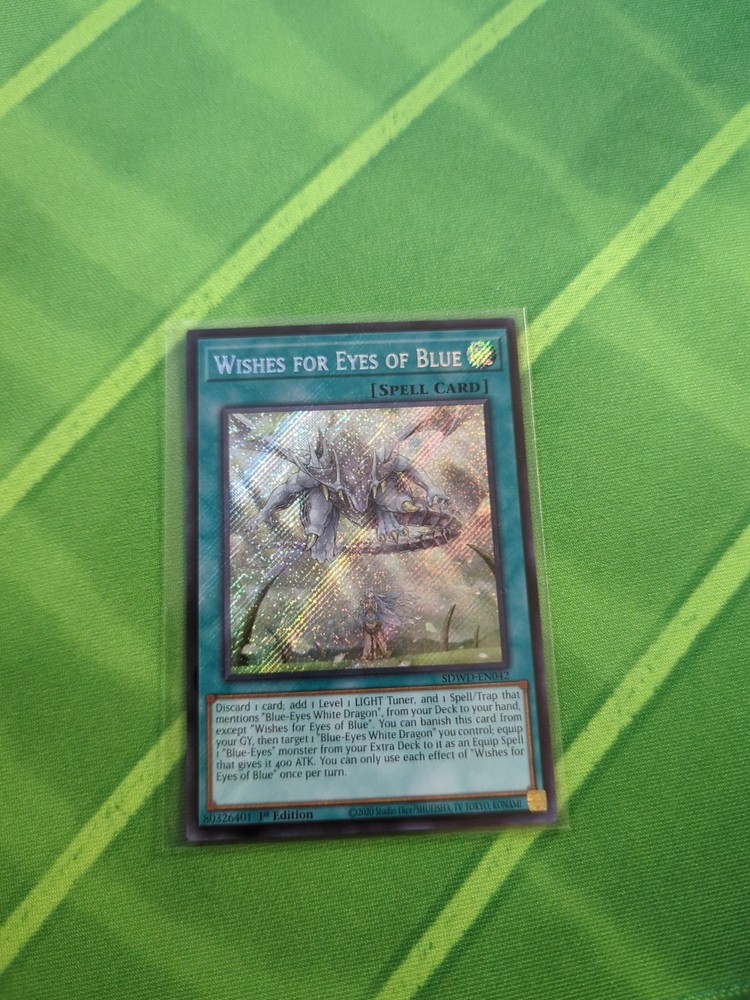 The YuGiOh Blue Eyes White Destiny - Wishes For Eyes Of Blue SDWD-EN042 -1st Edition card is a rare and highly sought-after collectible card from the Yu-Gi-Oh! TCG. This standard-sized card features a Dragon attribute and is part of the Structure Deck: Blue-Eyes White Destiny set. Produced by Konami, this English-language card is made of high-quality card stock and is perfect for players aged 6 and above. With its ultra rare status, 1st Edition printing, and unique Wish spell-type ability, this card is a valuable addition to any Yu-Gi-Oh! collection.