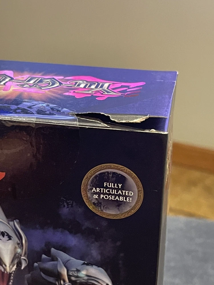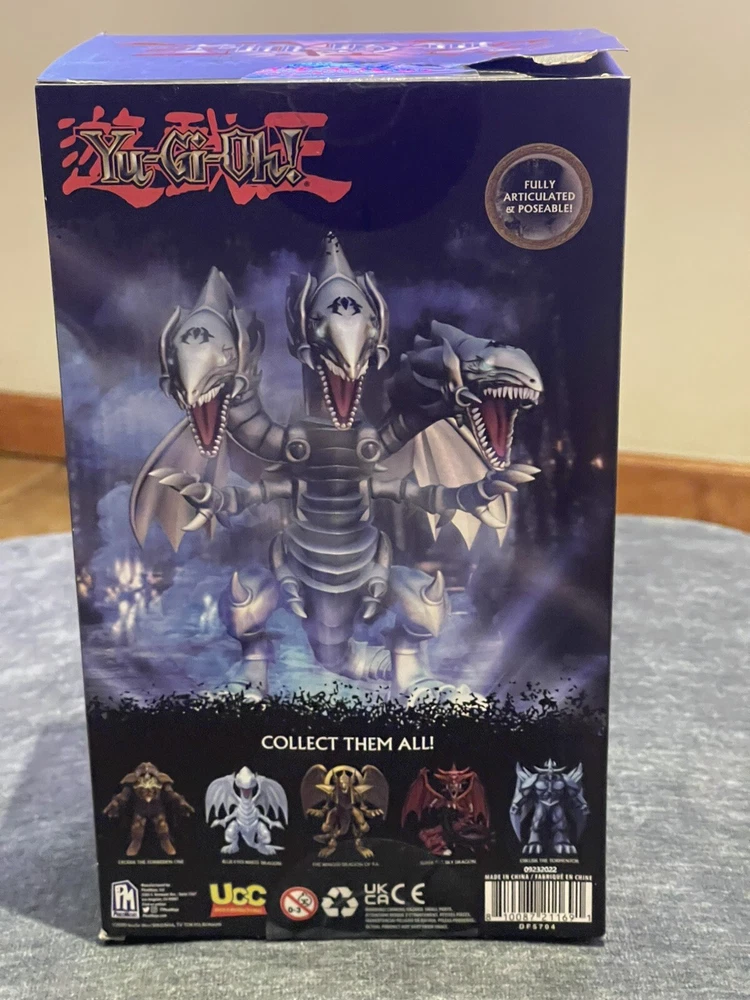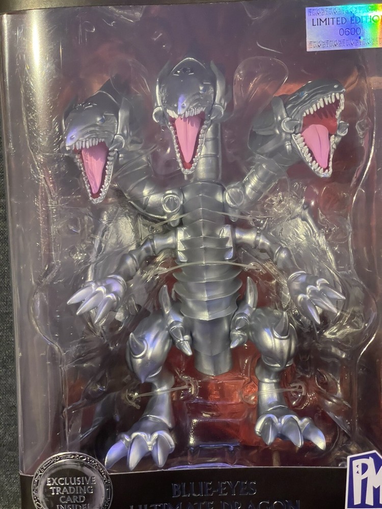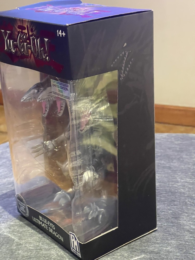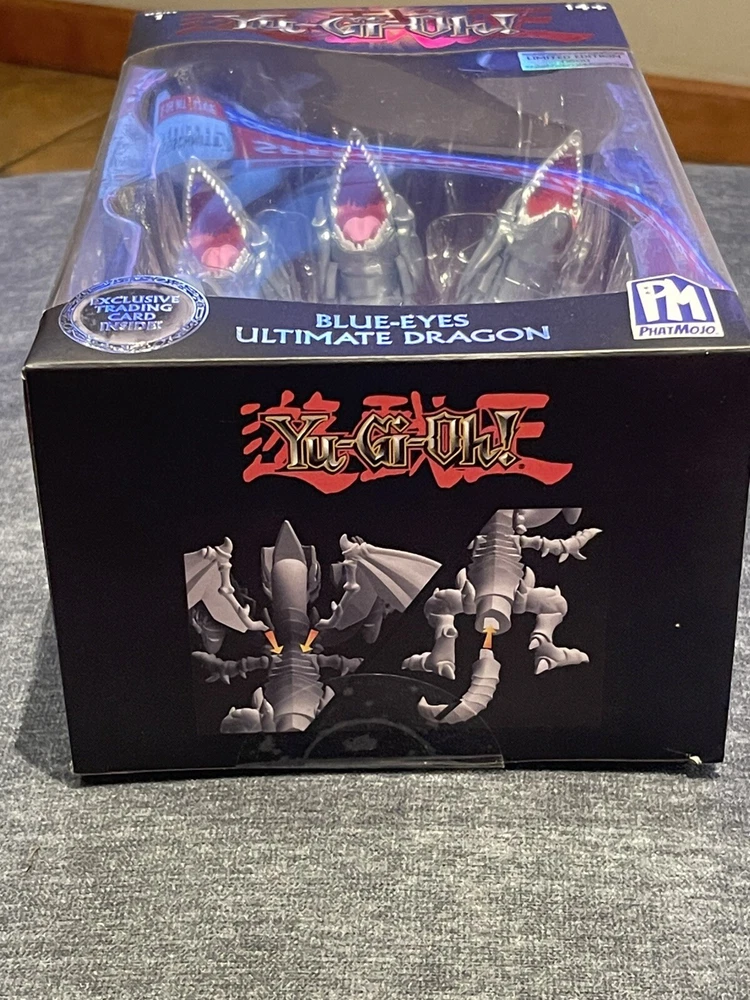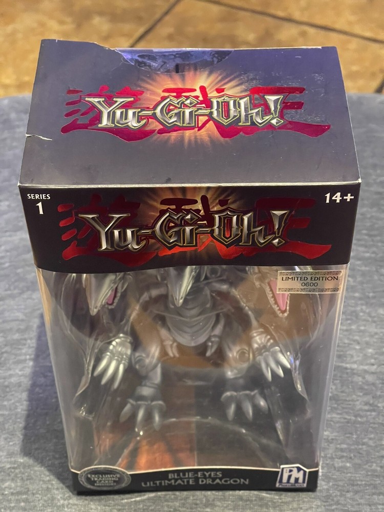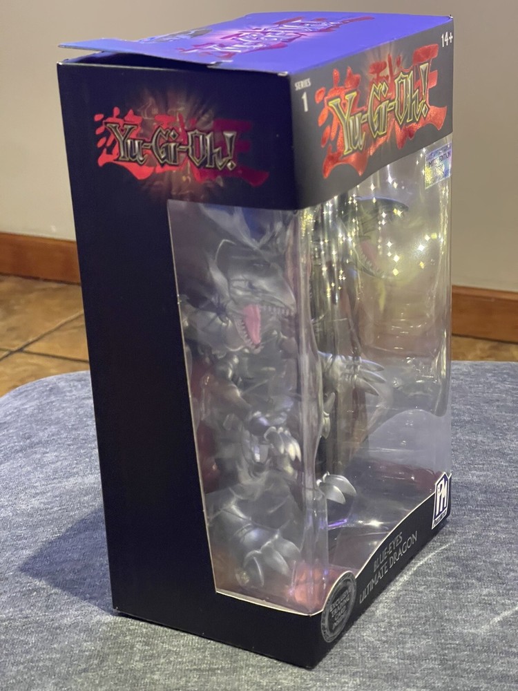 This is a Yu-Gi-Oh! Blue Eyes White Dragon action figure from Series 1 by PhatMojo. The figure is made of plastic and is a limited edition collectible item. It is based on the Yu-Gi-Oh! franchise and TV show, featuring the iconic Blue Eyes White Dragon character. The figure is boxed and designed for ages 14 and up, with a modern manufacturing period starting from 2020.