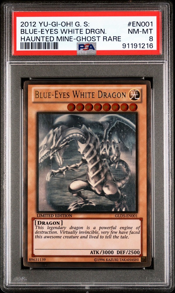 Rare Yu-Gi-Oh Blue Eyes White Dragon Limited Edition certified by PSA 8. Haunted Mine (GLD5-EN001) Ghost Rare! Don't miss the opportunity to own this magnificent card. See photos for buying! ⚔️