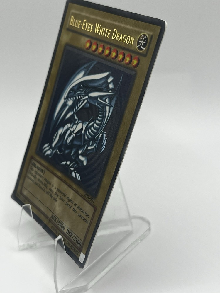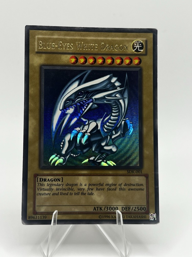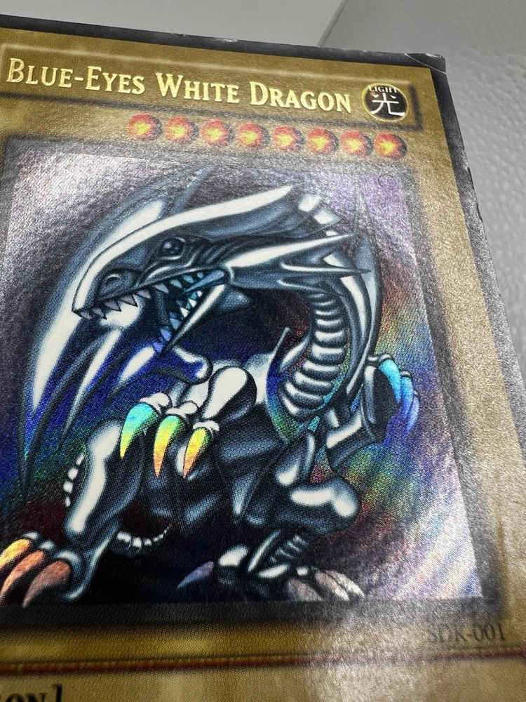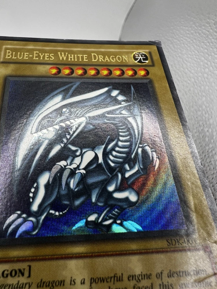 PERSONAL CHILDHOOD CARD AUTHENTICITY GUARANTEE! USA SELLER The Yu-Gi-Oh! Blue Eyes White Dragon card, with the card number SDK-001 and unlimited edition, is a highly sought-after collectible card game item. This card features a full holo bleed finish and is in excellent condition, ready to be added to any collection or used in a duel. It is an ultra rare card from the Starter Deck Kaiba set, manufactured by Konami and designed for players aged 6 and up. The card is a normal type with a light attribute and a dragon creature/monster type, featuring Seto Kaiba's character. Its rarity and design make it a must-have for any Yu-Gi-Oh! TCG collector or player.