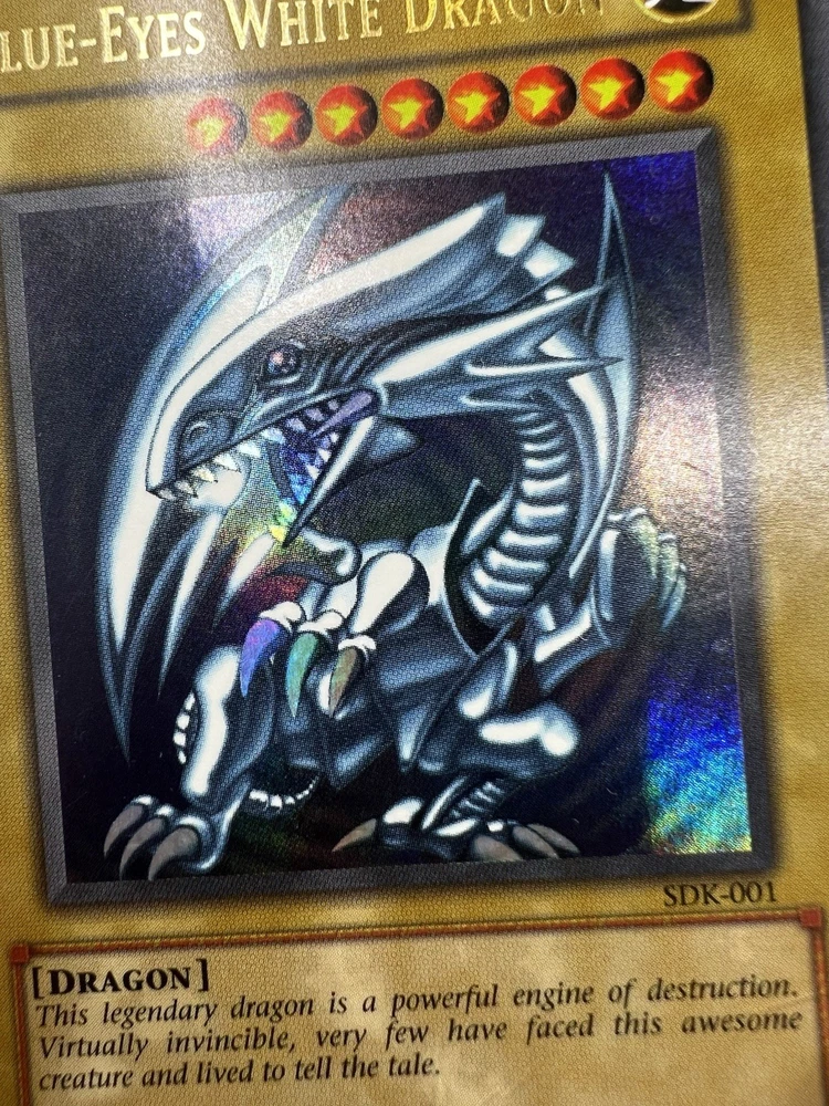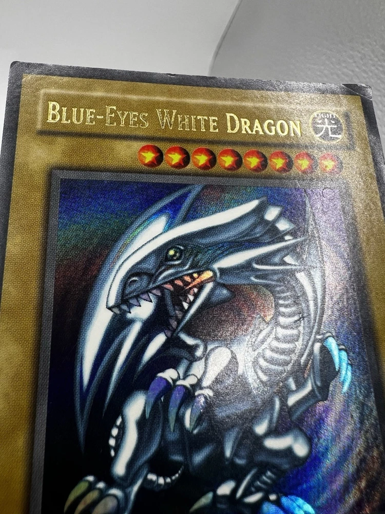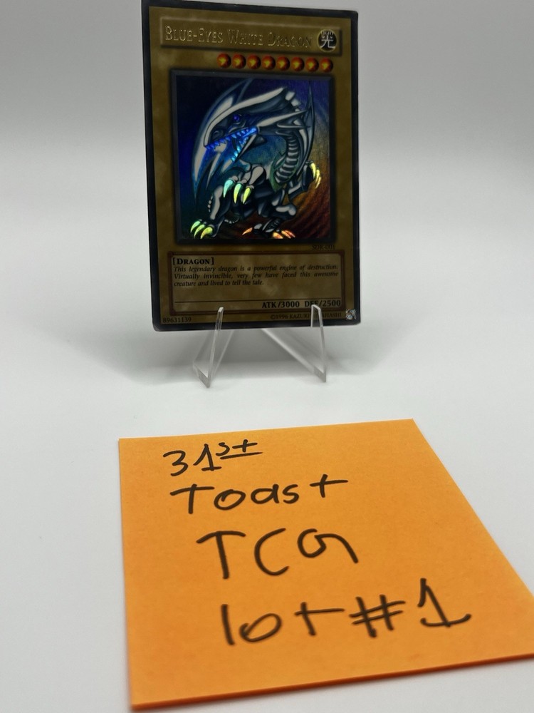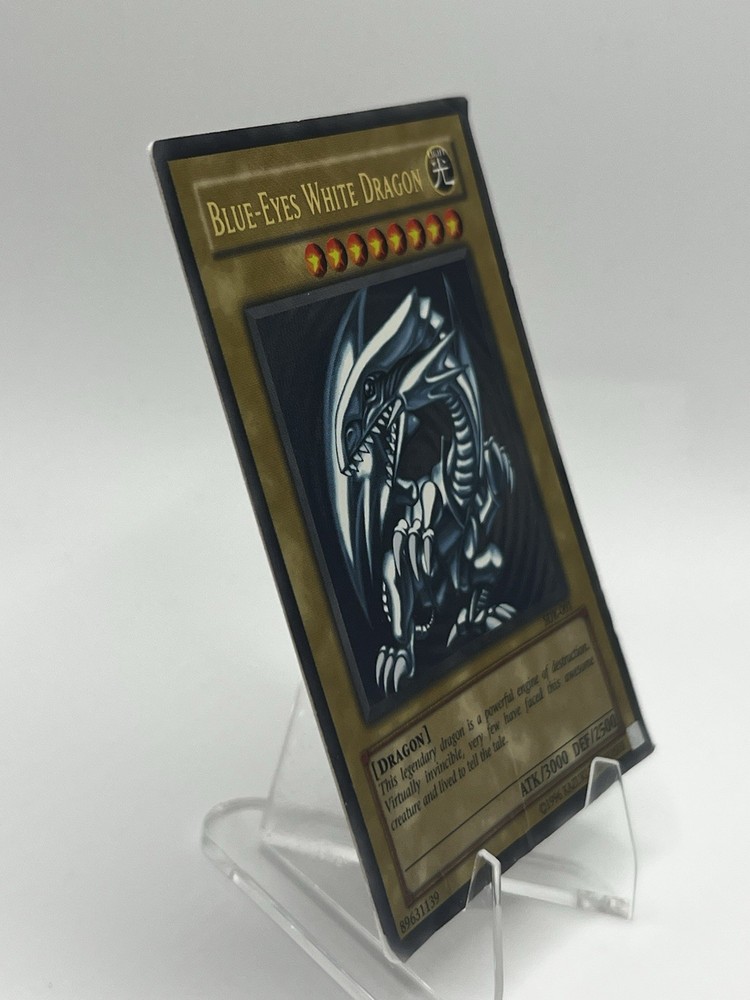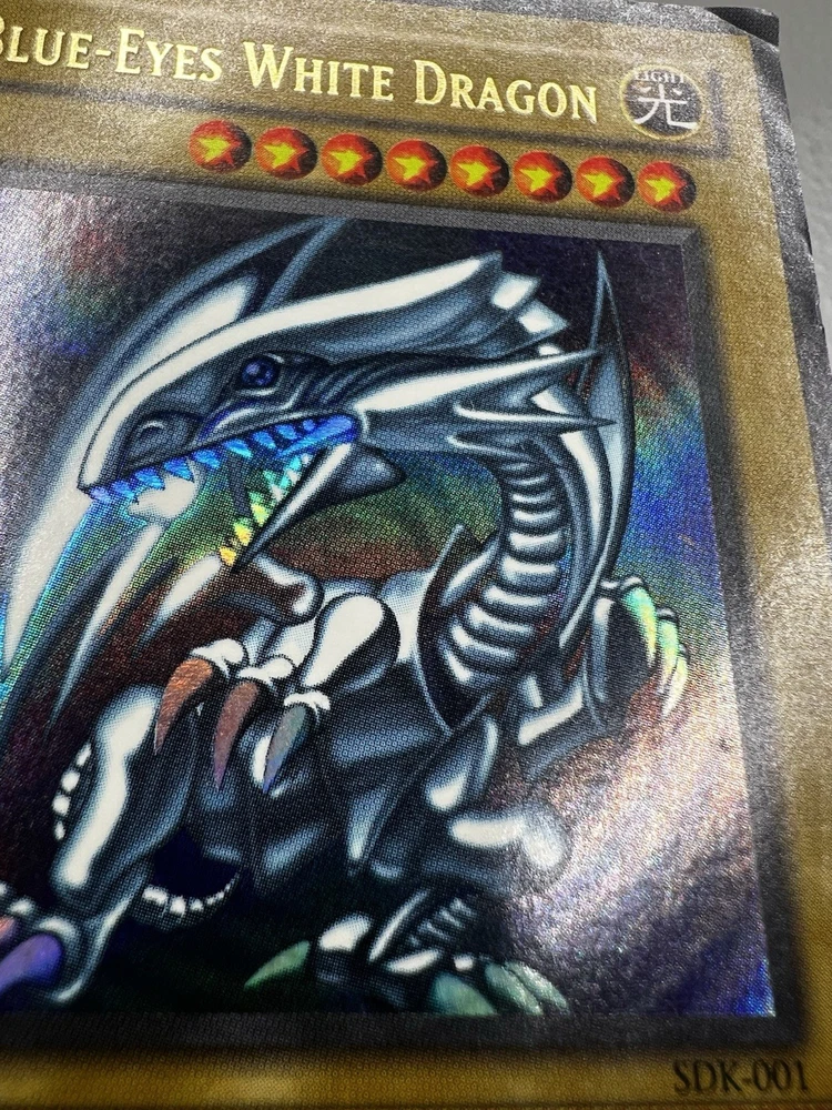 PERSONAL CHILDHOOD CARD AUTHENTICITY GUARANTEE! USA SELLER The Yu-Gi-Oh! Blue Eyes White Dragon card, with the card number SDK-001 and unlimited edition, is a highly sought-after collectible card game item. This card features a full holo bleed finish and is in excellent condition, ready to be added to any collection or used in a duel. It is an ultra rare card from the Starter Deck Kaiba set, manufactured by Konami and designed for players aged 6 and up. The card is a normal type with a light attribute and a dragon creature/monster type, featuring Seto Kaiba's character. Its rarity and design make it a must-have for any Yu-Gi-Oh! TCG collector or player.