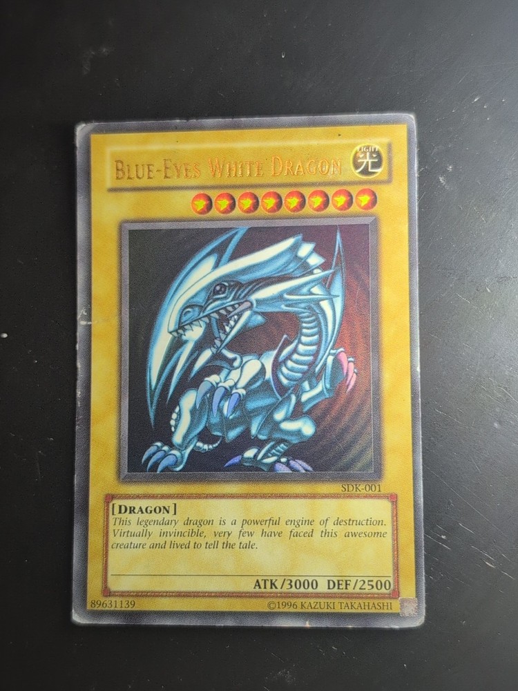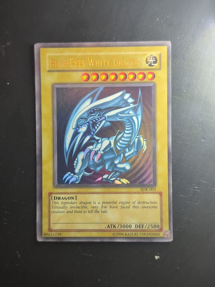 The Yu-Gi-Oh Blue Eyes White Dragon SDK-001 Ultra Rare card from 2002 features the iconic character Seto Kaiba and a Dragon monster type. With a high Defense/Toughness of 2500 and Attack/Power of 3000, this vintage card is a sought-after collectible in the Yu-Gi-Oh! TCG game. Made of card stock with a Holo finish, it is a must-have for fans and collectors alike, showcasing the artwork of Mitsuhiro Arita and manufactured by Konami in the United States.