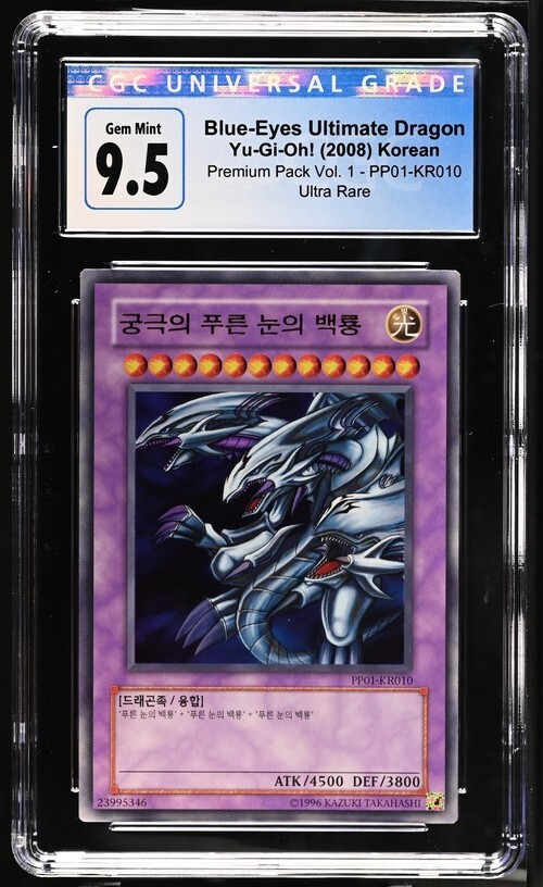 Blue-Eyes Ultimate Dragon is from the Korean Premium Pack set. It is professionally graded by CGC with a grade of 10 (Previously used label 9.5). **This specific CGC slab was the older blue label with GEM MINT 9.5, which can now be resubmitted for their newer equivalent black/white label GEM MINT 10, and is valued as such.** If you have any questions, feel free to send me a message! I will usually respond within 1-2 days. I'm open to accepting offers / making deals, especially if you plan to purchase multiple items! I can also consolidate shipping costs in that case.