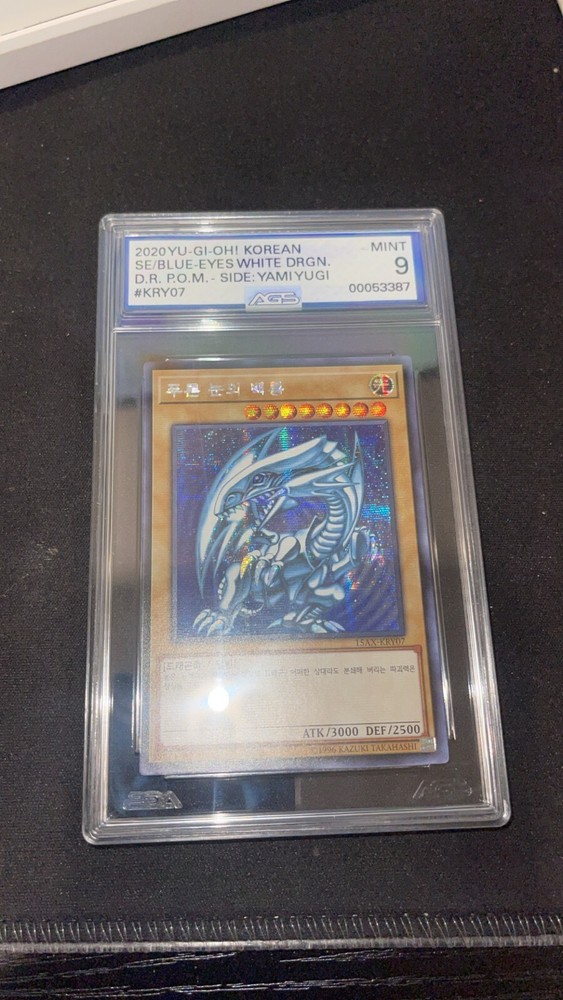 The Yu-Gi-Oh Blue-Eyes White Dragon 15AX-KRY07 Millennium EX Korean LP card is a rare and vintage collectible card game item from the "- Yugi -" set. This Japanese-made card features the iconic Dragon monster type in a holographic finish, making it a desirable addition for collectors. Manufactured by Konami in 2014, this Korean-language promo card is certified with a unique number and is graded by a professional grader. Suitable for ages 6 and above, this Millennium Rare card is part of the Yu-Gi-Oh! TCG game and is in Japanese card size.