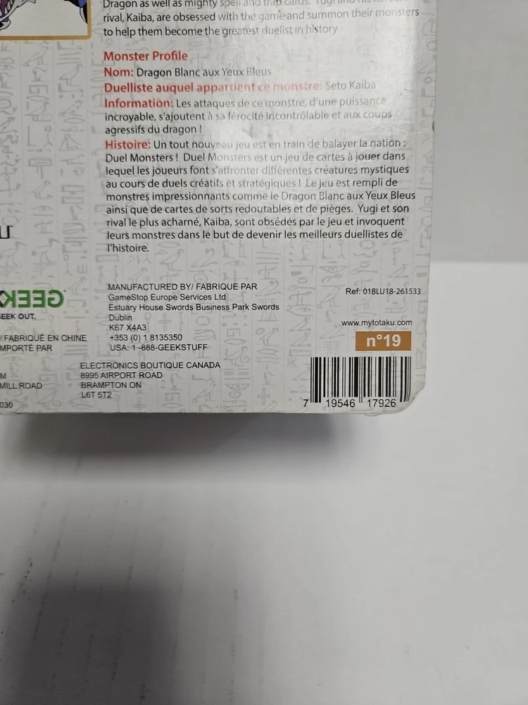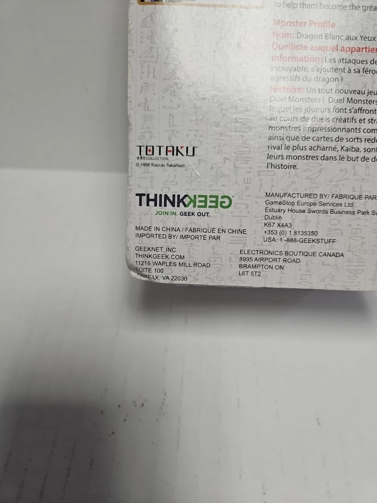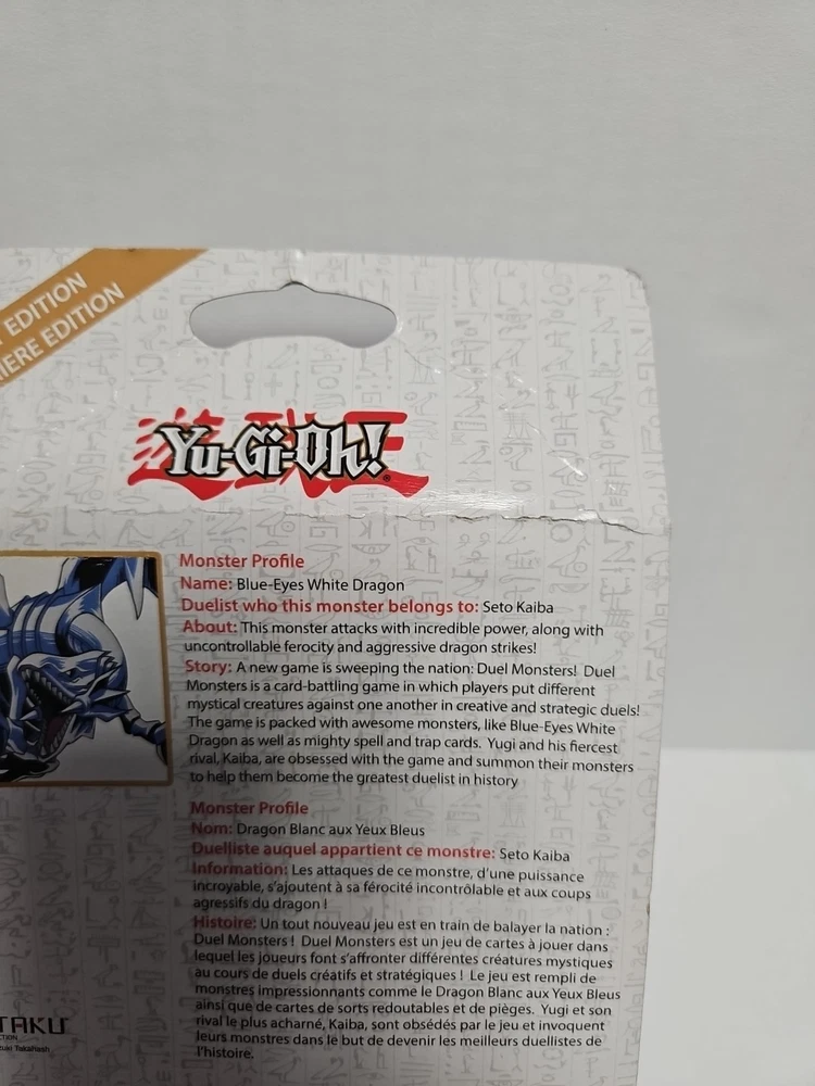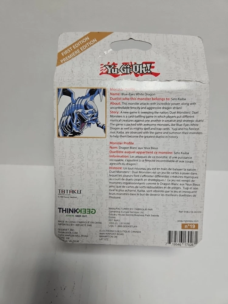 This product is a Vintage Yu-Gi-Oh! collectible figure of the Blue Eyes White Dragon from the Totaku Collection. The figure is made of plastic and was manufactured by Think Geek in 1996. It is suitable for ages 6 and up. ***Sealed New with Damaged Box as shown in pictures. Would of listed as Like New if option was avalible, Purchase of Item Verifys you have read this***