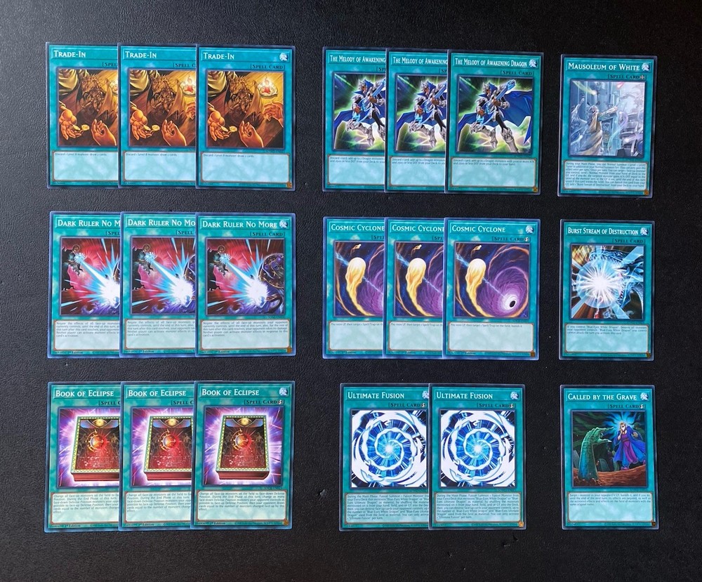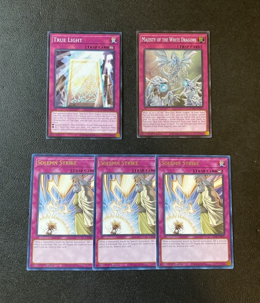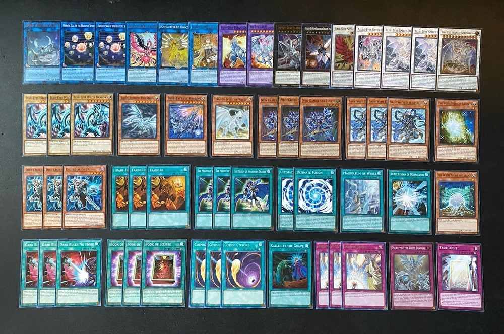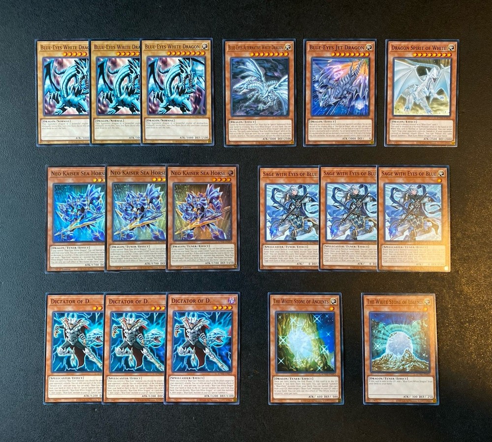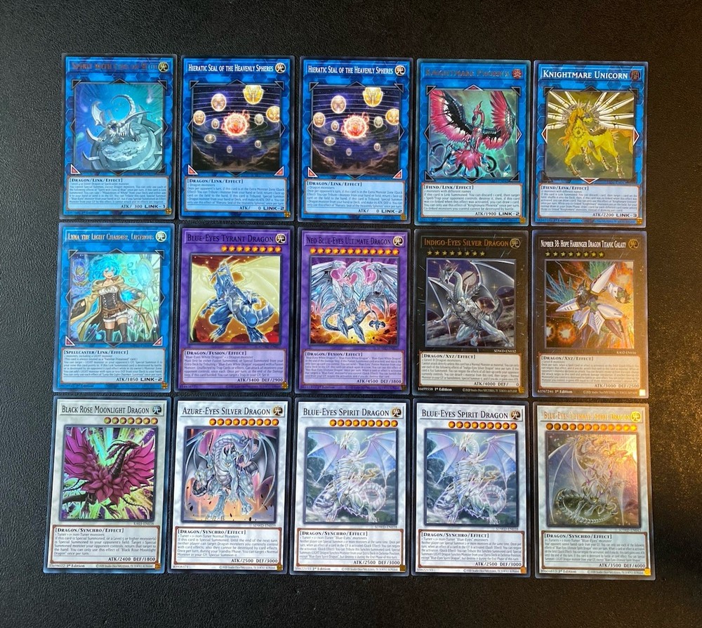 Yugioh Seto Kaiba Blue-Eyes White Dragon Deck. Everything is Near Mint. Extra Deck: 1x Spirit with Eyes of Blue - Ultra Rare 2x Hieratic Seal of the Heavenly Spheres - Common 1x Knightmare Phoenix - Ultra Rare 1x Knightmare Unicorn - Super Rare 1x Lyna The Light Charmer, Lustrous - Ultra Rare 1x Neo Blue-Eyes Ultimate Dragon - Common 1x Blue-Eyes Tyrant Dragon - Common 2x Blue-Eyes Spirit Dragon - Common 1x Azure-Eyes Silver Dragon - Common 1x Blue-Eyes Ultimate Spirit Dragon - Ultra Rare 1x Black Rose Moonlight Dragon - Super Rare 1x Indigo-Eyes Silver Dragon- Ultra Rare 1x Number 38: Hope Harbinger Dragon Titanic Galaxy - Super Rare Monsters: 3x Blue-Eyes White Dragon - Common 3x Neo Kaiser Sea Horse - Super Rare 3x Sage with Eyes of Blue - Common 3x Dictator of D. - Common 1x Blue-Eyes Alternative White Dragon - Common 1x Blue-Eyes Jet Dragon - Common 1x Dragon Spirit of White - Common 1x The White Stone of Legend - Common 1x The White Stone of Ancients - Common Spells: 3x Trade-In - Common 3x The Melody of Awakening Dragon - Common 1x Mausoleum of White - Common 2x Ultimate Fusion - Common 1x Burst Stream of Destruction - Common 1x Called By The Grave - Common 3x Dark Ruler No More - Common 3x Book of Eclipse - Common 3x Cosmic Cyclone - Common Traps: 3x Solemn Strike - Rare 1x Majesty of the White Dragons - Super Rare 1x True Light - Common
