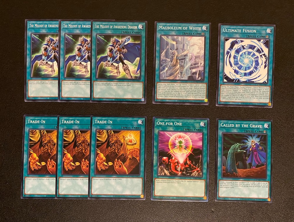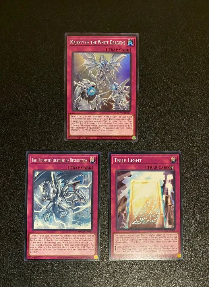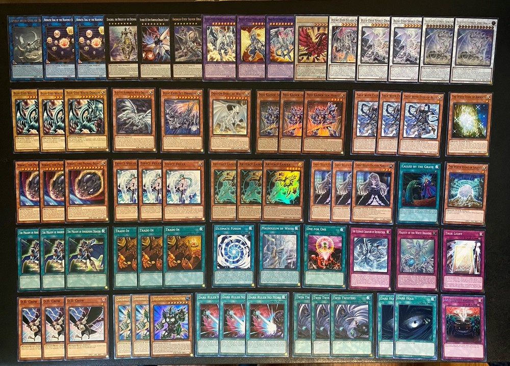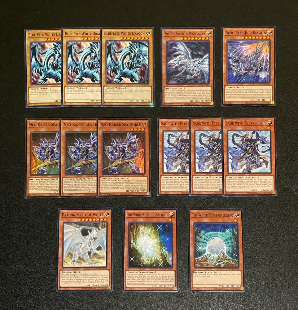 Yugioh Seto Kaiba Blue-Eyes White Dragon Deck. Everything is Near Mint. Extra Deck: Spirit with Eyes of Blue - Ultra Rare 2 Hieratic Seal of the Heavenly Spheres - Common Blue-Eyes Twin Burst Dragon - Ultra Rare Neo Blue-Eyes Ultimate Dragon - Common Blue-Eyes Tyrant Dragon - Common 2 Blue-Eyes Spirit Dragon - Common Azure-Eyes Silver Dragon - Common 2 Blue-Eyes Ultimate Spirit Dragon - Ultra Rare Blackrose Moonlight Dragon - Prismatic Ultimate Rare Dingirsu, The Orchust of Evening Star - Super Rare Indigo-Eyes Silver Dragon Deck- Ultra Rare Number 38: Hope Harbinger Dragon Titanic Galaxy - Super Rare Monsters: 3 Blue-Eyes White Dragon - Common 3 Neo Kaiser Sea Horse - Super Rare 3 Sage with Eyes of Blue - Common Blue-Eyes Alternative White Dragon - Common Blue-Eyes Jet Dragon - Common Dragon Spirit of White - Common The White Stone of Legend - Common The White Stone of Ancients - Common 3 Effect Veiler - Common 3 Ghost Belle & Haunted Mansion - Common 3 Nibiru, The Primal Being - Common 3 Artifact Lancea - Super Rare Spells: 3 The Melody of Awakening Dragon - Common 3 Trade-In - Common Mausoleum of White - Common Ultimate Fusion - Common One for One - Common Called By The Grave - Common Traps: Majesty of the White Dragons - Super Rare True Light - Common The Ultimate Creature of Destruction - Common Side Deck: 3 D.D. Crow - Common 3 Dinowrestler Pankratops (1 Ultra Rare + 2 Rare) 3 Dark Ruler No More - Common 3 Twin Twister - Common 2 Dark Hole - Common 1 Anti-Spell Fragrance - Rare