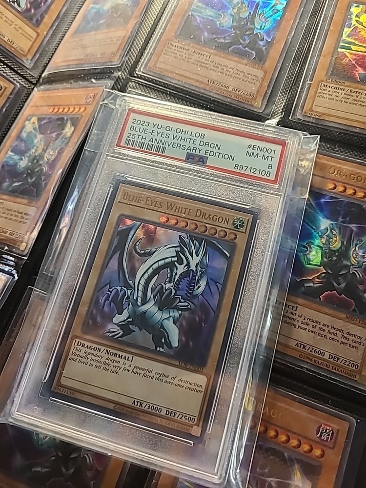 Yu-Gi-Oh! Blue-Eyes White Dragon LOB-001 Original Print card. Card is graded BGS 9 mint. Autographed by Eric Stuart. NOTE autograph is on OUTSIDE of slab and is NOT technically authenticated. I am confident it's legit. Card will be Shipped safely in bubblewrap.