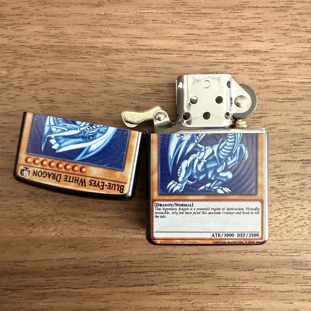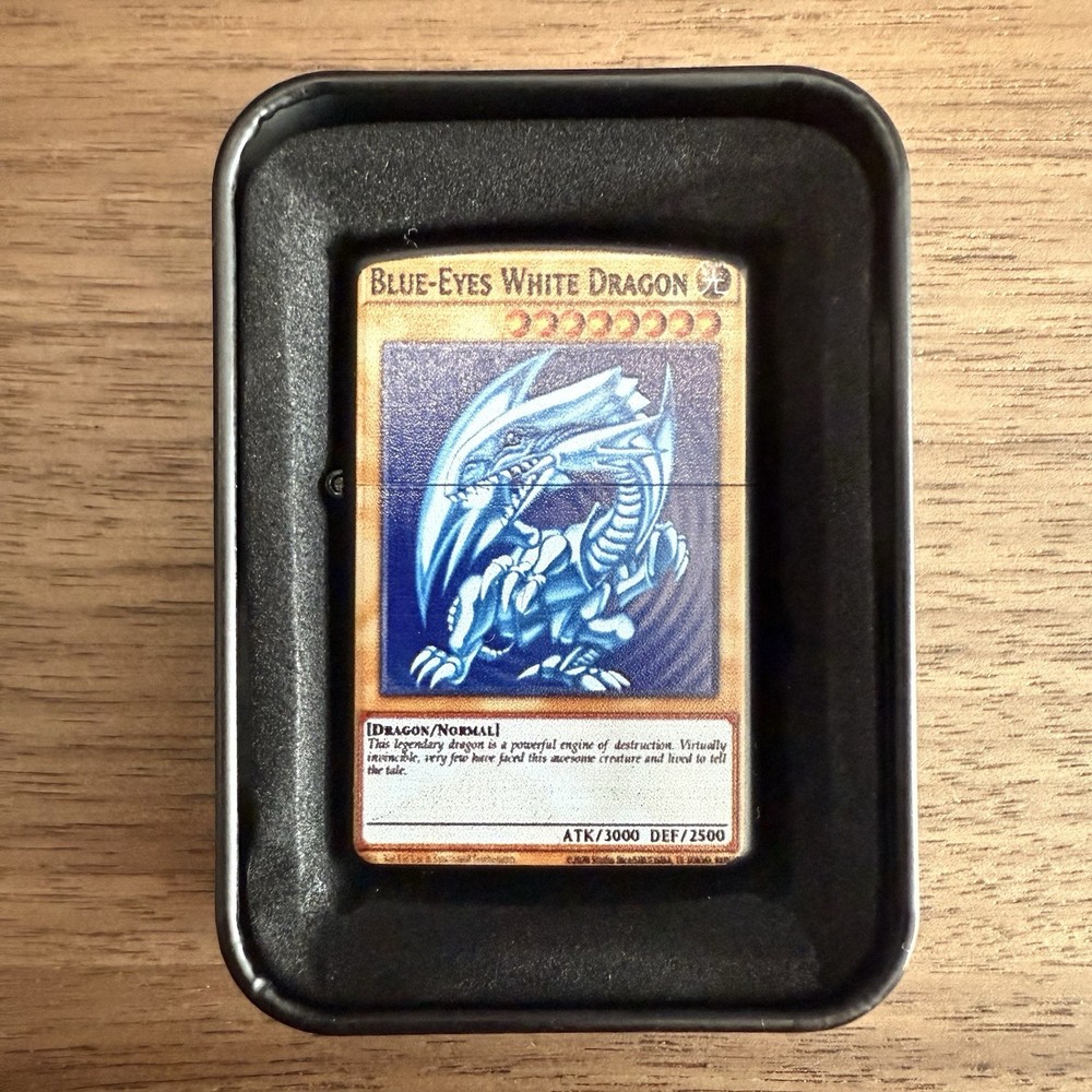 Blue-Eyes White Dragon Windproof Lighter Unleash the Blue-Eyes White Dragon! This collectible lighter features a durable all-metal build, windproof flame, and bold anime artwork — ready for fans and collectors. • Durable & Stylish: All-metal construction with a sleek, wind-resistant design • Compact Size: 2.28” x 1.54” x 0.51” – perfect for carrying anywhere • Signature “Click”: Classic flip-top sound and feel • Protective Case: Comes in a sturdy, metal tin for secure shipping and storage • Refillable: Designed for long-term use (lighter fluid not included) For best performance, we recommend using genuine lighter fluid, flints, and wicks DISCLAIMER: This is not a genuine Zippo® product. A legendary piece for anime fans and dueling champions!