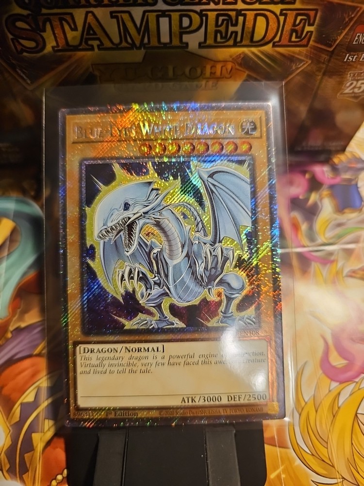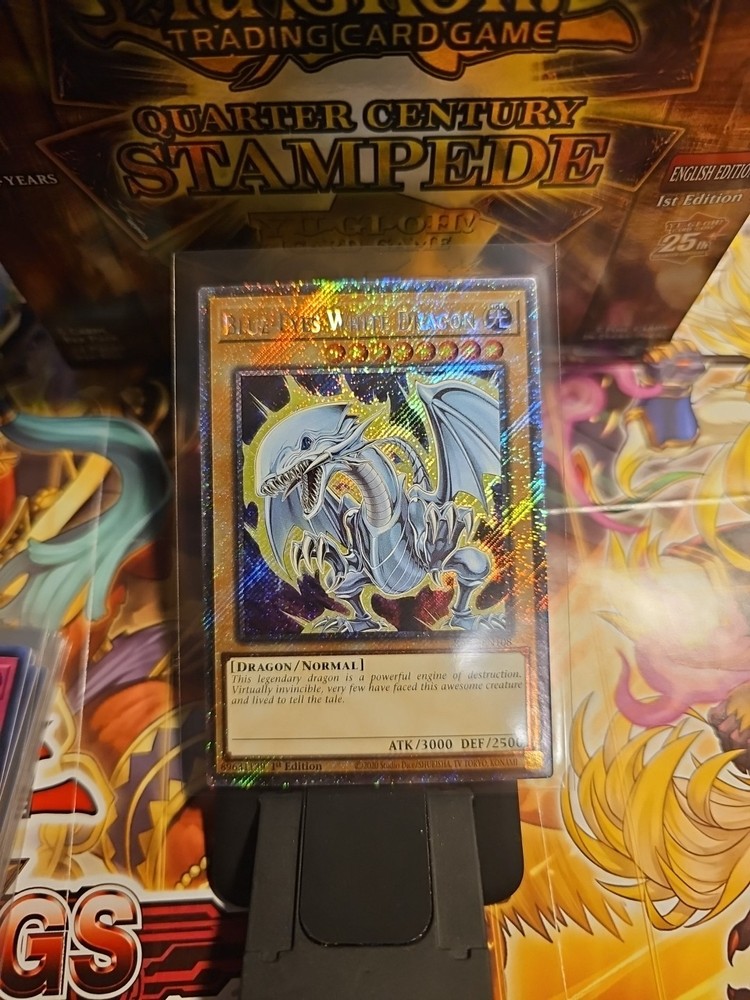 Elevate your Yu-Gi-Oh! TCG collection with the iconic Blue-Eyes White Dragon card, boasting the prestige of a Platinum Secret Rare (PSR) from the Quarter Century Stampede set. This holo card, numbered RA04-EN108, features the 7th Edition artwork that collectors and players alike have come to admire, encapsulating the essence of power and rarity in the game. As a non-autographed, English-language card produced by Konami, it's designed for duelists aged 6 and up. The Blue-Eyes White Dragon's normal card type is augmented by its unique attributes, including the sought-after 1st Edition status, ensuring it stands out in any collection or deck. This dragon's legacy is etched in the annals of Yu-Gi-Oh! TCG lore, making it a must-have for enthusiasts and competitive players.