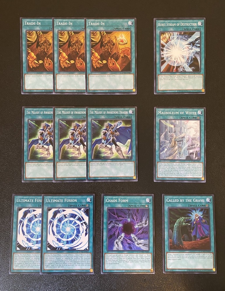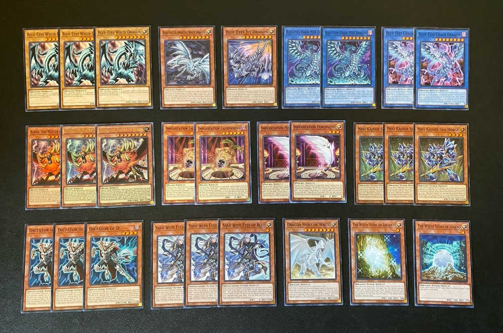 Yugioh Seto Kaiba Blue-Eyes White Dragon Deck. Everything is Near Mint. Extra Deck: 2x Spirit With The Eyes of Blue - Ultra Rare 1x Indigo-Eyes Silver Dragon - Ultra Rare 1x Number 97: Draglubion - Ultra Rare 1x Number 100: Numeron Dragon - Super Rare 1x Number 38: Hope Harbinger - Super Rare 1x Black Rose Moonlight Dragon - Prismatic Ultimate Rare 2x Blue-Eyes Spirit Dragon - Common 2x Blue-Eyes Ultimate Spirit Dragon - Ultra Rare 2x Blue-Eyes Twin Burst Dragon - Common 1x Blue-Eyes Tyrant Dragon - Common 1x Neo Blue Eyes Ultimate Dragon - Common Monsters: 3x Blue-Eyes White Dragon - Common 1x Dragon Spirit of White - Common 1x Blue-Eyes Alternative White Dragon - Common 1x Blue-Eyes Jet Dragon - Common 2x Blue-Eyes Chaos Max Dragon - Common 2x Blue-Eyes Chaos Dragon - Common 3x Neo Kaiser Sea Horse - Super Rare 2x Impcantation Talismandra - Common 2x Impcantation Penciplume - Common 3x Alpha, The Master of Beasts - 2 Ultra Rare + 1 Super Rare 3x Dictator of D. - Common 3x Sage with Eyes of Blue - Common 1x The White Stone of Ancients - Common 1x The White Stone of Legend - Common Spells: 3x Trade-In - Common 3x The Melody of Awakening Dragon - Common 2x Ultimate Fusion - Common 1x Mausoleum of White - Common 1x Burst Stream of Destruction - Common 1x Chaos Form - Common 1x Called By The Grave - Common Traps: 1x Destined Rivals - Common 1x The Ultimate Creature of Destruction - Common 1x Majesty of The White Dragon - Super Rare 1x True Light - Common
