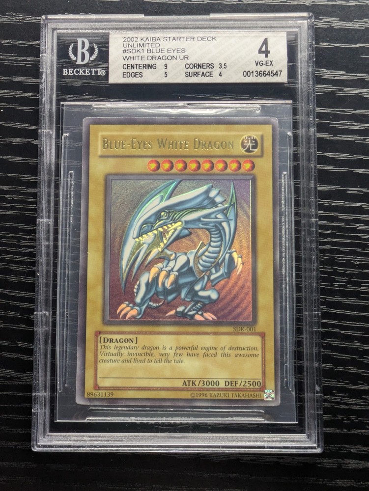 This is a 2002 Yu-Gi-Oh! Blue-Eyes White Dragon card, SDK-001, from the Kaiba Starter Deck, Unlimited Edition. It's an Ultra Rare card, graded VG-EX 4 by Beckett Grading Services (BGS), with centering at 9, corners at 3.5, edges at 5, and surface at 4!