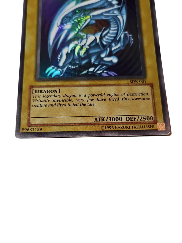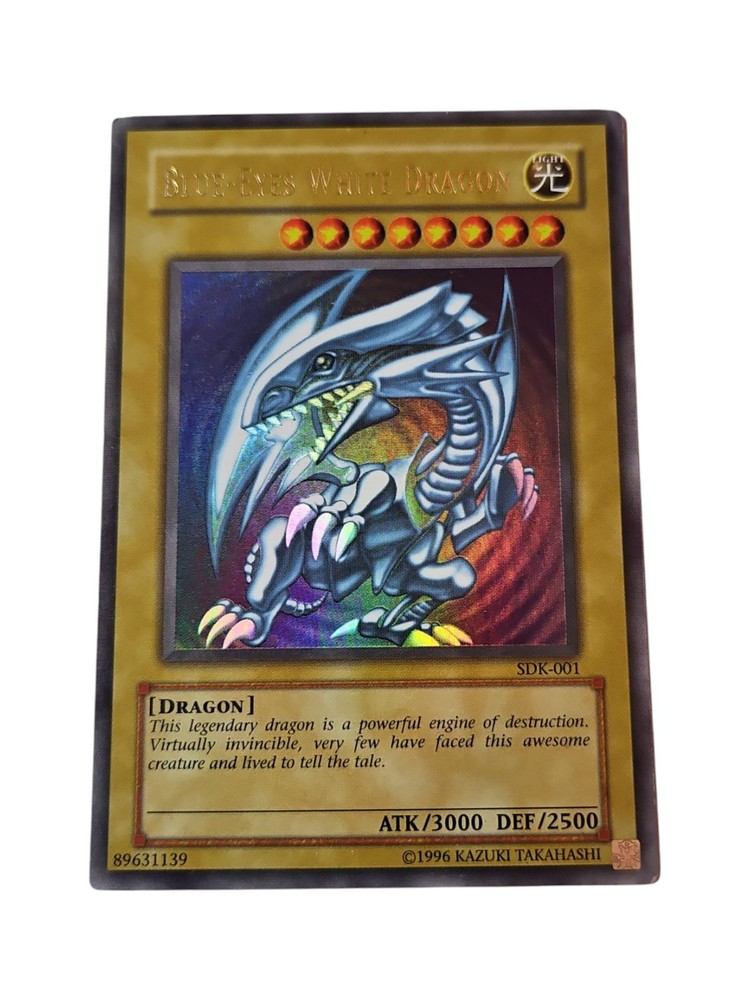 The Yu-Gi-Oh! Blue-Eyes White Dragon SDK-001 Ultra Rare card is a highly sought-after collectible in the world of Yu-Gi-Oh! TCG. With its light attribute, dragon type, and holo finish, this vintage card from the Kaiba set, manufactured in 2002, holds significant value for collectors and players alike. English language and ultra rare rarity make this card a prized possession for fans of the game, showcasing its iconic design and symbolism within the Yu-Gi-Oh! universe.