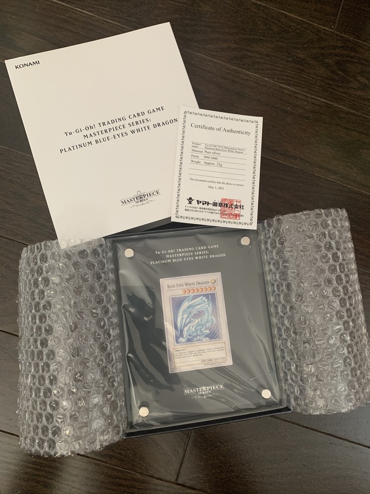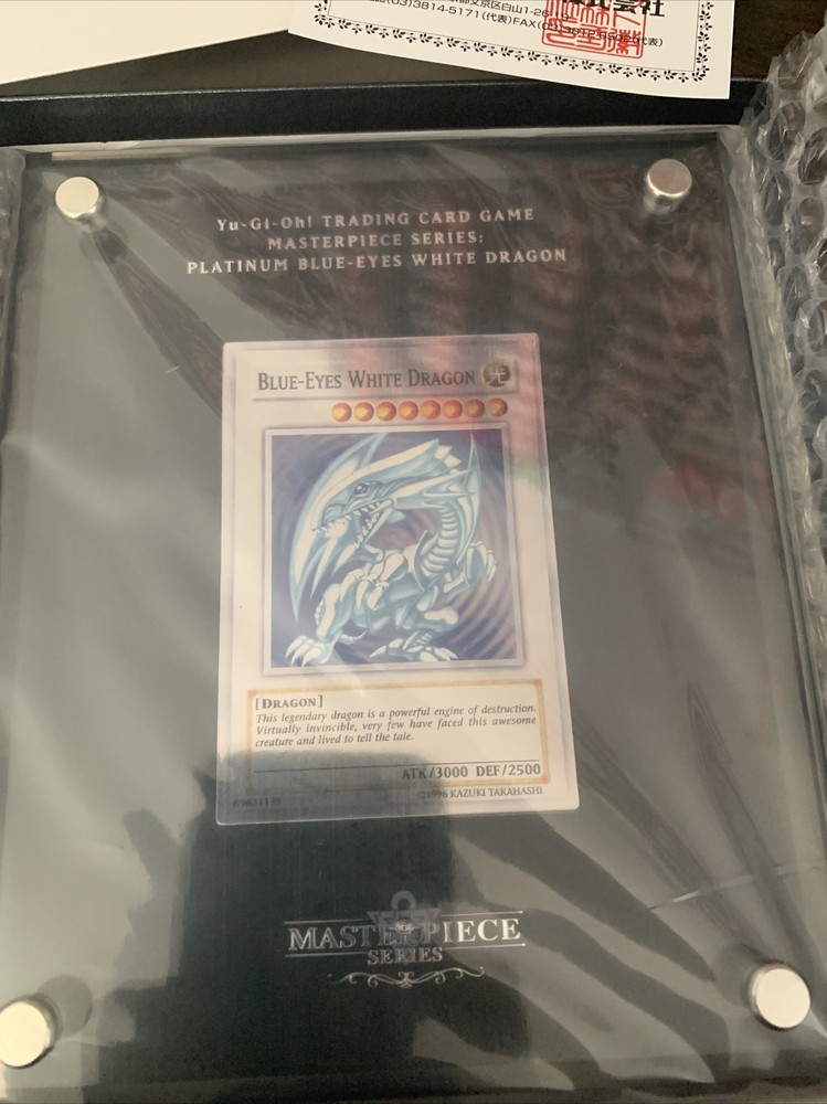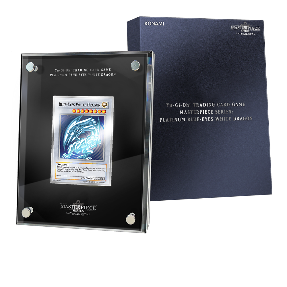 TRADING CARD GAME MASTERPIECE SERIES: PLATINUM BLUE-EYES DRAGON YU GI OH Card # 800 out of 1000! Celebrate in style, with a special, all-metal Blue-Eyes White Dragon card! This item is limited to one thousand initial copies in the Americas, US Version. Made of 99.9% pure silver, burnished to a platinum-colored finish, and encased in a protective brick of acrylic, at a thousand dollars each these cards are not for everyone.