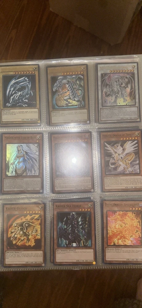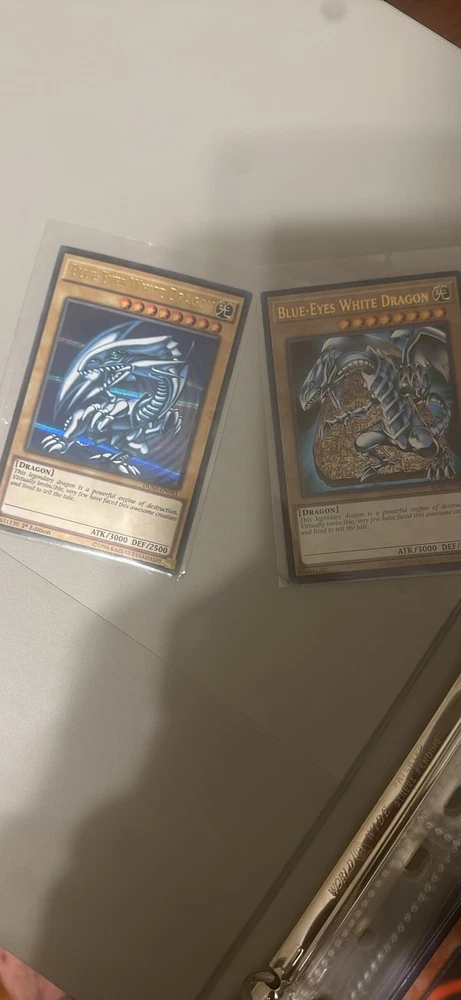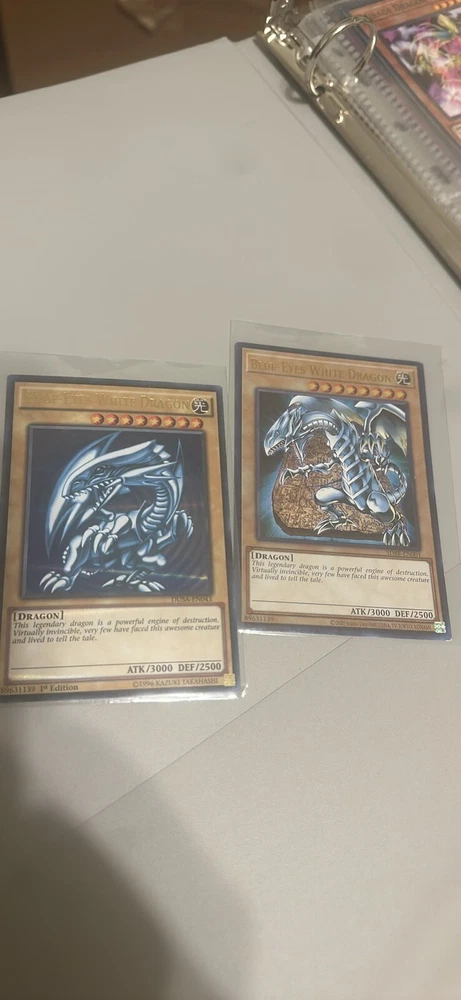This Yu-Gi-Oh! TCG card collection features a vintage Blue Eyes White Dragon, with 1st Edition printing and made of high-quality card stock. The card is from the Yugi set, manufactured by Konami in the United States. It is a monster card with a blue color attribute, perfect for any collector or player of the game. The binder contains 43 cards total including some rare cards & 2 blue eyes white dragons one from 1996 first edition and the other from 2020 and 41 other cards some you’ve seen on the tv show. The card is part of a larger collection of Yu-Gi-Oh! TCG cards, ideal for anyone looking to expand their collection or achieve their goals in the game. This rare and sought-after card is a must-have for any fan of the game and will make a great addition to any collection.