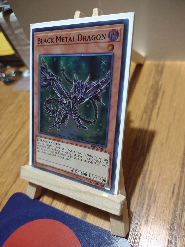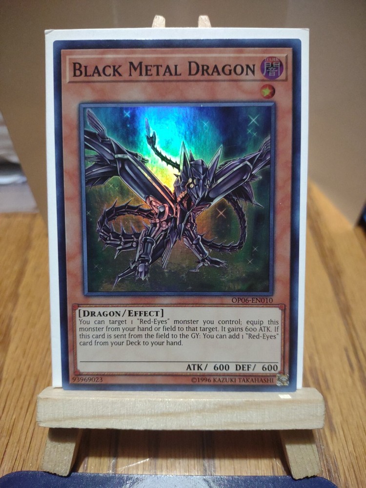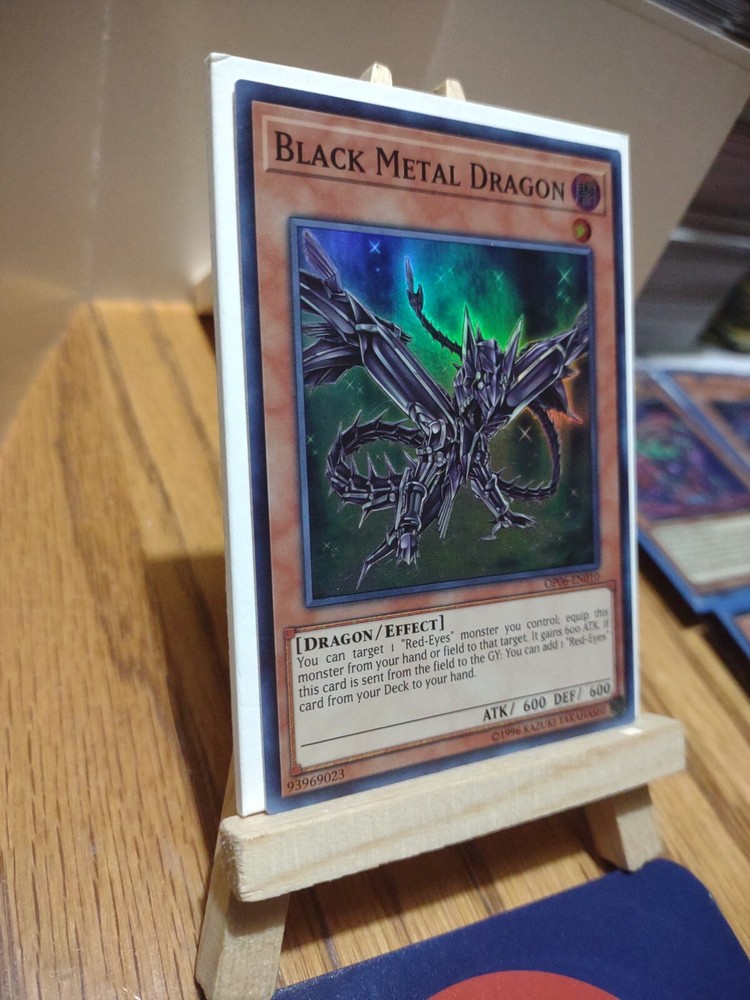 This Yu-Gi-Oh! card features the iconic Black Metal Dragon, with a holographic finish and super rare rarity. It is part of the OTS Tournament Pack 6 set, and has the card number 93969023. The card is made of high-quality card stock and is standard sized. The Black Metal Dragon is an effect type card with the attribute of Dark, and it is suitable for players aged 6 and above. The card is in English language and has no autograph. It is a collectible trading card game item from the Yu-Gi-Oh! TCG, and is perfect for any fan or collector. May have small imperfect on cards see pictures for the condition of this item. Thank you