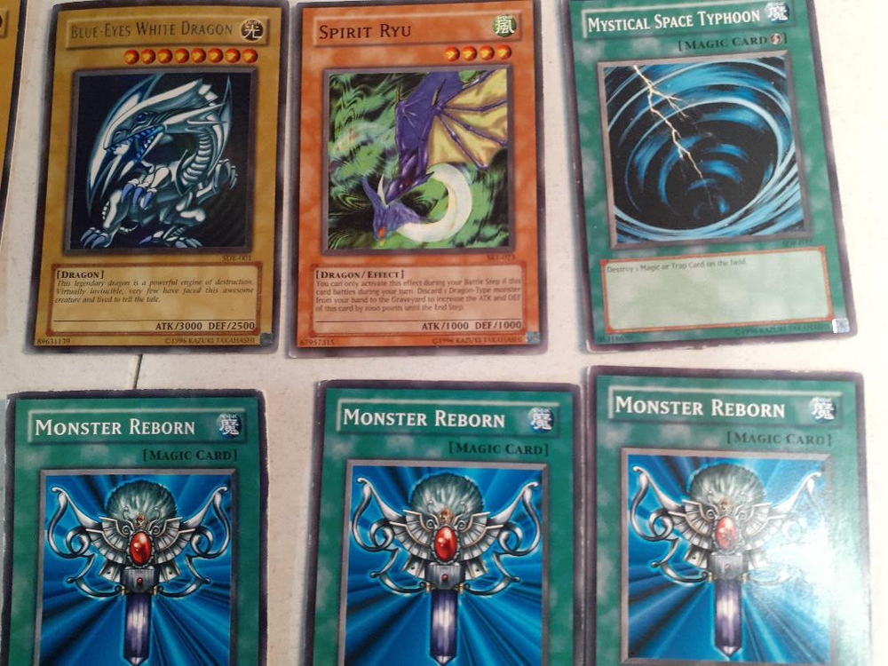 9X YuGiOh! CardS 1x Red Eyes B. Dragon 1x Blue-Eyes White Dragon foil print 1x Blue-Eyes White Dragon 4x Monster Reborn Blue Spirit Ryu 1x Mystical Space Typhoon 1x Spirit Ryu Used been played with NOT MINT