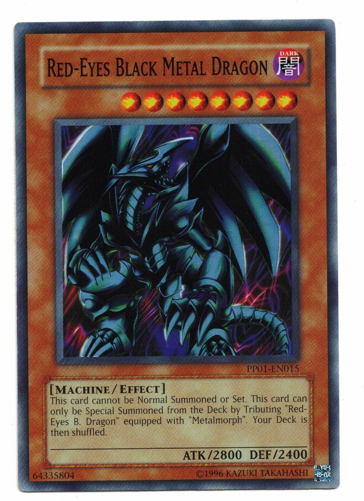 This listing is for a great Yu-Gi-Oh! Card. You get: Red Eyes Black Metal Dragon PP01-EN015 Super Rare! This card is in Near Mint Condition. Actual Card Pictured. Check out our other items! We add new items all the time, be sure to add us to your Favorite Sellers List. CONDITION DEFINITIONS: Mint : A perfect or virtually perfect card. We do not sell cards as Mint in order to ensure customer satisfaction. Near Mint : May have some very light edge wear and/or scratching. Excellent : Edge wear and/or scratches becoming more noticeable. May have a few light indentations. Good : Shows signs of play. Has bends, scratches, indentations, minor creases, and/or increasing edge wear. Played : Severe bends, creases, edge wear and/or scratches. Damage is extremely noticeable. POKEMASTER.CARDS SALES INFORMATION: History/Background We specialize in high quality collectibles with great prices, accurate descriptions, and super fast shipping. With thousands of items sold, you can be confident that you will be very happy with your purchase! We add new items all the time, be sure to add us to your Favorite Sellers List. Click the "Save this seller" link above or in our store! Shipping Information Cards are safely packed in a protective plastic sleeve, wrapped in a packing slip, and then reinforced with cardboard and tape. Most cards are shipped via USPS First Class Mail, which usually arrives quickly (within 3-6 business days). WE COMBINE SHIPPING! Be sure to order items together to save big! Customer Service As you can see from our great feedback, we work very hard to ensure that EVERY customer is fully satisfied. Please contact us with ANY concerns BEFORE leaving feedback and we will promptly address any issue. We want 5 STARS in every category and will do what it takes to earn them.