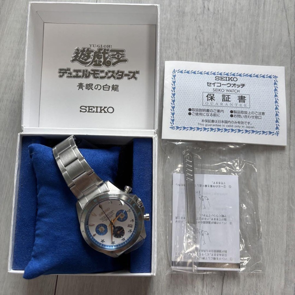 Description Yu-Gi-Oh! Duel Monsters × Seiko Wristwatch (Blue-Eyes White Dragon) This is a brand-new, unused item. It has been displayed since purchase and has never been worn. Serial Number : 211 Specifications [Size] Case size: Approx. 47.0mm (H) × 39.8mm (W) × 12.8mm (D) Lug width: Approx. 20mm Band length: Approx. 15.5–20.0cm [Features] Movement: Quartz Functions: Tachymeter, 24-hour hand, small seconds hand, stopwatch (1/5-second measurement, 60-minute timer), calendar (date) Water resistance: Enhanced for daily use (10 ATM / 100m) [Materials] Case: Stainless steel Band: Stainless steel Glass: Curved Hardlex Case back: Screw-back (Please note: the orientation of the case back may vary due to manufacturing processes) Other: Serial number engraved on the case back [Country of Origin] Japan ( Please note that due to individual differences in the product, there may be slight variations from the listed specifications. ) Dial Color : White Band Color : Silver Movement : Quartz / Battery-powered Features : Chronograph Accessories : Warranty card Condition : No scratches, cracks, or damage All my products are 100% Authentic. Please feel free to contact us if you have any question. Shipping We ship using FedEx, DHL and Japan Post. Payment We usually ship within 5〜10 business days of receiving cleared payment. International Buyers - Please Note: Import duties, taxes and charges are not included in the item price or shipping charges.These charges are the buyer’s responsibility.Please check with your country’s customs office to determine what these additional costs will be prior to bidding/buying. These charges are normally collected by the delivering freight (shipping) company or when you pick the item up do not confuse them for additional shipping charges. I do not mark merchandise values below value or mark items as "gifts" - US and International government regulations prohibit such behavior. For U.S. Buyers (Shipping to the United States): Import duties, taxes, and related customs fees are already included in the item price or shipping cost (DDP: Delivered Duty Paid) . You will not be required to pay any additional customs charges upon delivery. Note: Items over USD 2,500 per transaction (including shipping) or those under the Authenticity Guarantee service may be excluded.