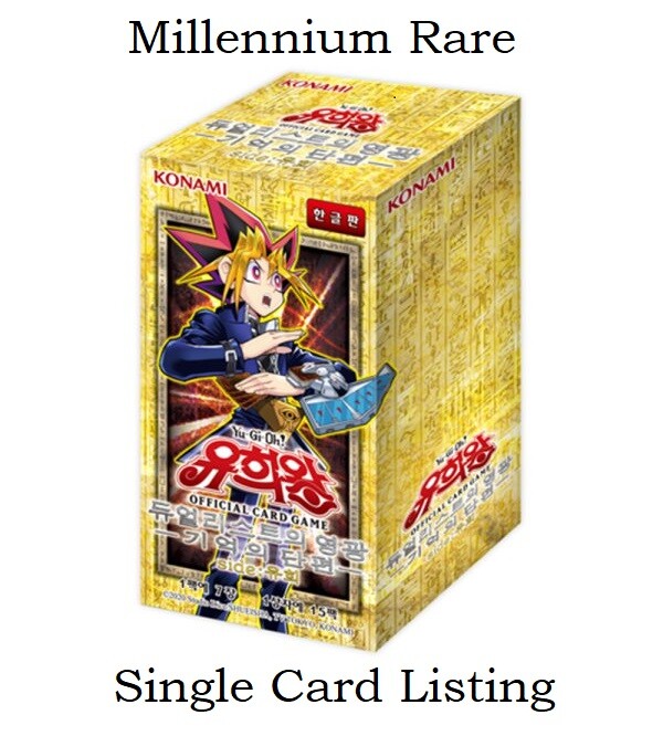 This listing is for cards from the Korean Duelist Road -Piece of Memory- Side: Yugi Muto in Millennium Rare. Cards are fresh from the pack and never played. Full List of Individual Cards Available for Purchase Electromagnetic Turtle [15AX-KRM04] Black Illusion [15AX-KRM05] Celtic Guardian [15AX-KRM06] Tiger Axe [15AX-KRM08] Zoa [15AX-KRM09] Seiyaryu [15AX-KRM10] Pendulum Machine [15AX-KRM11] Launcher Spider [15AX-KRM12] Magician's Valkyria [15AX-KRM15] Red-Eyes Black Metal Dragon [15AX-KRM16] Panther Warrior [15AX-KRM18] Harpie's Pet Dragon [15AX-KRM19] Cyber Harpie Lady [15AX-KRM20] Amazoness Chain Master [15AX-KRM21] Metalzoa [15AX-KRM22] Fairy King Truesdale [15AX-KRM25] Teva [15AX-KRM26] Rigorous Reaver [15AX-KRM29] Goddess of Whim [15AX-KRM30] Sinister Serpent [15AX-KRM31] Zera the Mant [15AX-KRM32] Super War-Lion [15AX-KRM33] Dragon Master Knight [15AX-KRM34] Flame Swordsman [15AX-KRM37] Monster Reborn [15AX-KRM38] Temple of the Kings [15AX-KRM43] The Mask of Remnants [15AX-KRM44] Polymerization [15AX-KRM45] Seal of the Ancients [15AX-KRM46] Harpie's Feather Duster [15AX-KRM47] Skull Dice [15AX-KRM48] Kunai with Chain [15AX-KRM50] Exchange of the Spirit [15AX-KRM51] Metalmorph [15AX-KRM52] Trap of Darkness [15AX-KRM53] Widespread Ruin [15AX-KRM54] Aqua Chorus [15AX-KRM56] The Wicked Eraser [15AX-KRM57] The Wicked Dreadroot [15AX-KRM58] The Wicked Avatar [15AX-KRM59]