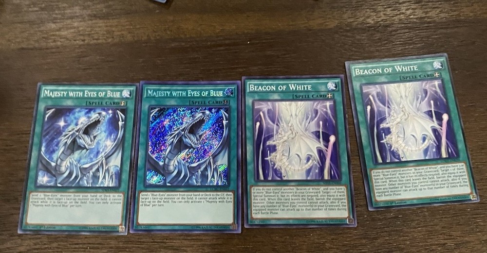 This is a Small Collection of Cards Related to Blue Eyes White Dragon Included inside are Monsters -2x Maiden with Eyes of Blue -2x Protector with Eyes of Blue -2x Master with Eyes of Blue -2x The White Stone of Legend -1x Kaibaman Spells -2x Majesty with Eyes of Blue -2x Beacon of White Extra Deck -1x Azure-eyes Silver Dragon All Cards are in near mint to Lightly Played condition and will be inside a mix of Card Sleeves and Top Loaders to help protect them If you have any questions or requests for more photos pls reach out on eBay’s messaging system I do commonly take offers especially when it involves more than one item at a time don’t hesitate to reach out If you make a purchase of at least 1 item for any price that’s over the minimum allowed offer I will accept the lowest allowed offer on up to 3 other items I have listed