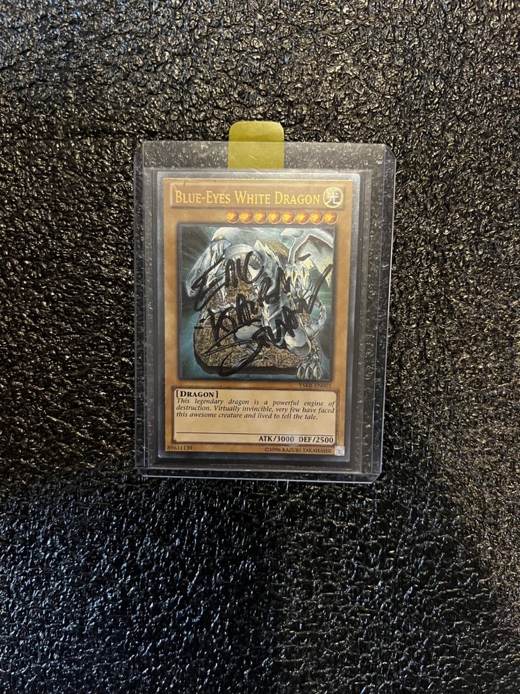 The product is a Yu-Gi-Oh! card from the "Yugi" set featuring the character Seto Kaiba with the card name "Dragons." It is a holographic Blue-Eyes White Dragon signed by Eric "Kaiba" Stuart, known for voicing Kaiba in the Yu-Gi-Oh! animated series. No cancellations.