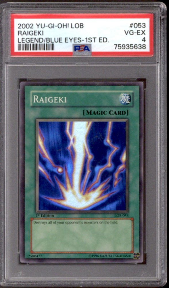 Leading the Collectibles Industry for Over 30 Years Leading in the Collectibles Industry for Over 30 Years Store Home Bookmark Us Feedback Contact Us MENU Store Categories Sports Trading Cards Autographs Vintage Sports Memorabilia Toys & Hobbies Comic Books & Memorabilia Autographs Non-Sports Trading Cards Collectible Figures & Supplies Animation Art & Merchandise Video Games & Consoles Entertainment Memorabilia Coins & Paper Money Store Support Store Home Bookmark Us View Our Feedback Contact Us Store Categories Sports Trading Cards Autographs Vintage Sports Memorabilia Toys & Hobbies Comic Books & Memorabilia Autographs Non-Sports Trading Cards Collectible Figures & Supplies Animation Art & Merchandise Video Games & Consoles Entertainment Memorabilia Coins & Paper Money Fast, Secure Shipping Satisfaction Guaranteed Hassle-Free 30-Day Returns Friendly, Expert Buyer Support Click Thumbnails to Enlarge Product Description Yu-Gi-Oh Legend of Blue Eyes White Dragon 1st Edition Raigeki LOB-053 PSA 4 Yu-Gi-Oh Legend of Blue Eyes White Dragon 1st Edition Raigeki LOB-053 PSA 4 Questions about this item? Click here to contact us! » Payment Payment Policy If payment is not received within 7 days, we reserve the right to cancel the transaction and relist the item. For larger credit card orders, proof of identity may be required. International credit cards are NOT accepted. Based on applicable tax laws, eBay will calculate and collect sales tax for items shipped to customers in the United States Shipping Shipping Policy For the Shipping Rate Calculator, click the "Shipping and payments" tab at the top of this listing Most orders process within one business day after we receive payment. Orders are packed securely and shipped promptly. Most cases are double-boxed to avoid damage in transit. We offer combined shipping discounts for customers who win more than one auction within 3 days of each other and pay for all items at the same time (please contact us in advance for exceptions). If the shipping charge at check-out doesn't seem right, please use the "Ask Seller for Invoice" option before paying. Orders shipping to P.O. Boxes, APO , and FPO must ship via the U.S. Postal Service. Orders going to Alaska, Hawaii, Puerto Rico, and other US Territories are subject to a $15.00 shipping surcharge. Local Pick-Up may be available in Western NY for free; contact us prior to bidding. Intl. Shipping International Shipping For items shipping via the eBay Global Shipping Program, please refer to their information located here Due to contractual agreements with Upper Deck, Konami, and Wizards of the Coast, items manufactured by Upper Deck are not eligible for shipping to Canada until one (1) calendar year after the products initial release. Items manufactured by Konami and Wizards of the Coast (WOTC) are not eligible for shipping outside of the United States and its' territories. We are sorry for any inconvenience. Any duties or taxes that may be imposed by the respective countries are your sole responsibility. Import duties, taxes, and charges are NOT INCLUDED in the item price or shipping charges. These charges are the buyer's responsibility. Please check with your country's customs office to determine what these additional costs will be prior to bidding / buying. These charges are normally collected by the delivering freight (shipping) company or when you pick the item up, do not confuse them for additional shipping charges. Also do not request us to declare items at a lower value, it is not an option, as it is illegal in the United States. Mail fraud, a felony, carries a sentence of up to five years in prison and/or fines of up to $250,000. We ship most orders via UPS. Orders shipping via UPS should arrive within a week after we receive payment. About Us About Dave & Adam’s Card World When you shop with Dave and Adam's Card World, rest assured knowing that you are dealing with an established business, the best in the industry. The world's largest source of trading cards and collectibles In business since 1991 Accredited by the Better Business Bureau BizRate Platinum Circle Of Excellence Honoree for outstanding Customer Service 50,000 square-foot custom facility with over 60 people on staff We supply thousands of customers, including many stores, dealers, and collectors...let us help you as well! We are recognized throughout the industry for... Great Prices Factory-Sealed Unsearched Product Unbeatable Customer Service Fast Shipping Dave and Adam's Card World, LLC Fast, Secure Shipping Satisfaction Guaranteed Hassle-Free 30-Day Returns Friendly, Expert Buyer Support Shop By Category Sports Trading Cards Autographs Vintage Sports Memorabilia Toys & Hobbies Comic Books & Memorabilia Autographs Non-Sports Trading Cards Collectible Figures & Supplies Animation Art & Merchandise Video Games & Consoles Entertainment Memorabilia Coins & Paper Money Store Home Bookmark Us View Our Feedback Contact Us Copyright © Dave & Adam's Card World . All rights reserved. eBay Template Design NinjaTemplates
