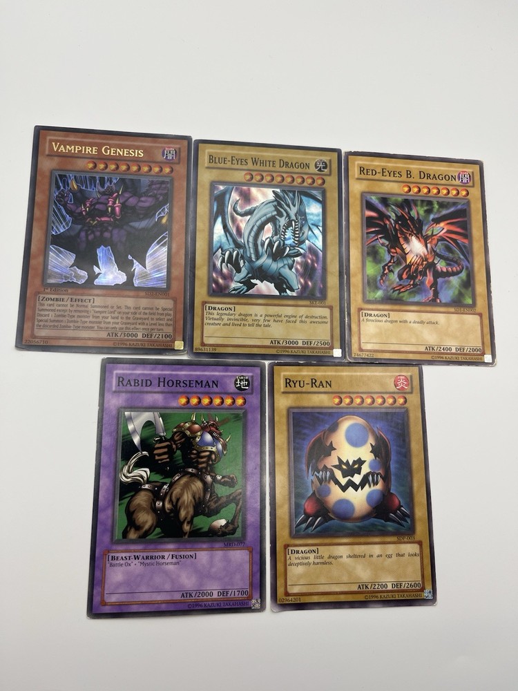 Vintage Yu-Gi-Oh! collectible card lot featuring iconic cards such as Blue Eyes White Dragon, Vampire Genesis 1st Edition, Red Eyes B Dragon, Ryu-Ran, and Rabid Horseman. Five card lot.
