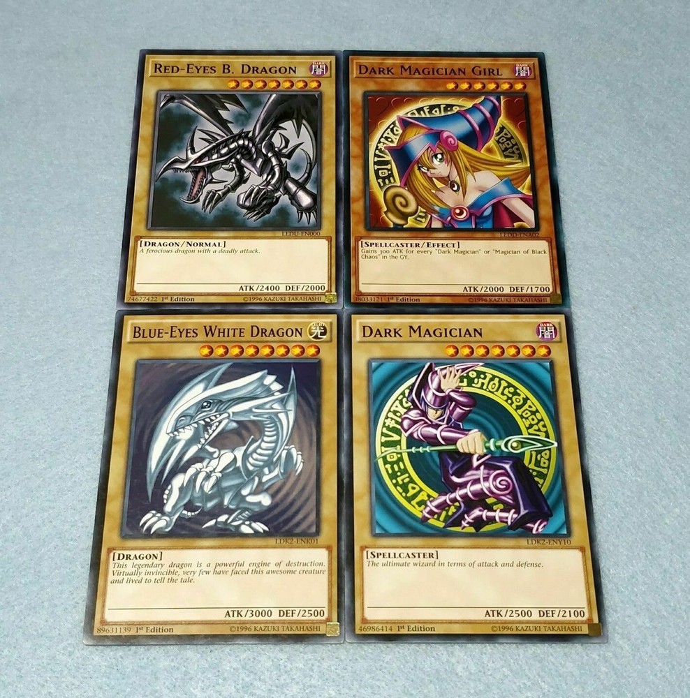 Hello all I am a New Ebay Seller!!! I am a Female Yugioh & Magic Collector!!! Happy Bidding!!! A bonus for ordering you will also Get a Free Holo Card from my collection. It maybe Super Rare, Ultra Rare, or SECRET Rare!!! Picture may have been edited due to Inventory Changes Please read description Below Shipping - All orders will be shipped with bubble mailer and a protective case. - I ship to both Domestic (U.S.) and International destinations! Please Allow me up to 10 Business days before the item will be shipped!!! Thank You!!! **If you are a international buyer, Customs Fees are the responsobility of the Buyer** Payment - Please pay within 3 days of your order to avoid an Unpaid Item Case. This just helps me run things smoothly for other bidders/buyers and myself. Will appreciate if you please leave feedback when you receive your item, and I will leave feedback as well. Contact me if anything is wrong with your order so I can have a chance to fix the issue- Your satisfaction is most important! Item for sale is: You will receive the following items: Blue Eyes White Dragon Dark Magician Girl Red Eyes Black 4 Card Set Lot You will receive one of each card, it may not be exactly the art as the picture due to inventory and randomness but you will receive 4 cards. The auction is for all 4 cards listed below: Blue Eyes White Dragon - LDK2-ENK01 or LED3-EN006 or SBCB-EN087 or SDKS-EN009 or SDDC-EN004 Dark Magician - LEDD-ENA01 or SBCB-EN001 or LDK2-ENY10 or SS01-ENA01 Dark Magician Girl - LED6-EN000 or LDK2-ENY11 or YSYR-EN011 Red-Eyes B. Dragon - LDK2-ENJ01 or LEDU-EN000 or SBCB-EN167 or SDDC-EN005 or SS02-ENB01