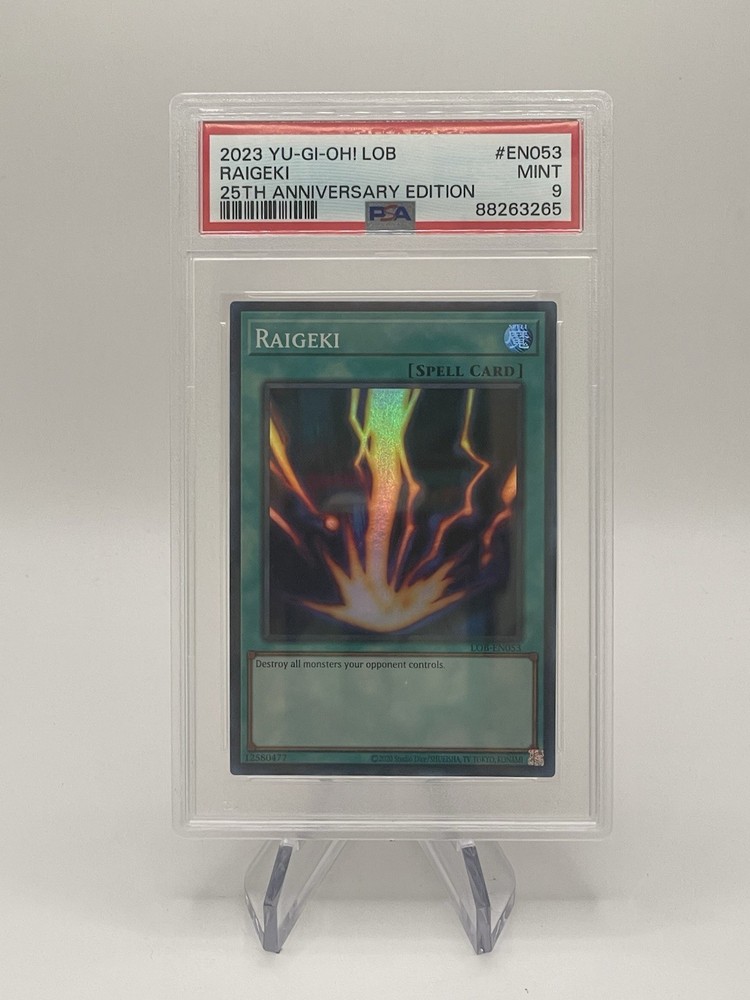 Unleash the power of Legend of Blue Eyes White Dragon with the iconic Raigeki card, a must-have for any Yu-Gi-Oh! TCG enthusiast. This Super Rare Spell card, with its striking artwork and strategic gameplay advantage, is a timeless addition to your collection, celebrating its 25th anniversary. Elevate your dueling experience with the Raigeki card, known for its ability to drain an opponent's life directly from their deck. A classic from the Legend of Blue Eyes White Dragon set, this card is a staple for those aiming to achieve a swift victory in their next battle.