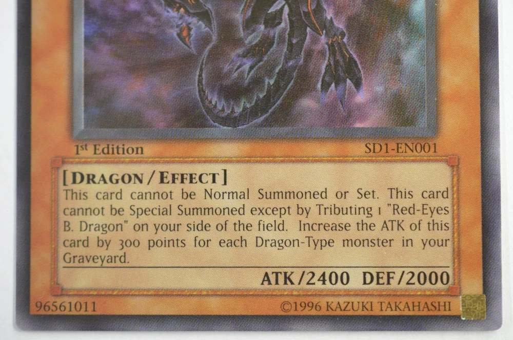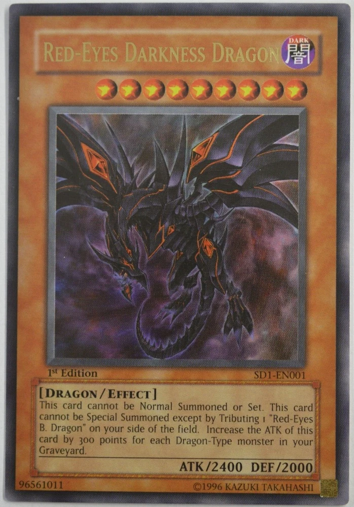 Unleash the power of the legendary Red-Eyes Darkness Dragon with this ultra-rare card from the Dragon's Roar set. As a cornerstone of the Yu-Gi-Oh! TCG, this card features the iconic Red Eyes Black Dragon in all its glory, boasting a striking holographic finish that's sure to catch the eye of collectors and players alike. With card number SD1-EN001, this Effect-type monster comes straight from the heart of the set, ready to make a BREAK into your deck. Printed in English and manufactured in the United States in 1999, this card is a must-have for anyone looking to enhance their game with the might of a Dark attribute dragon.