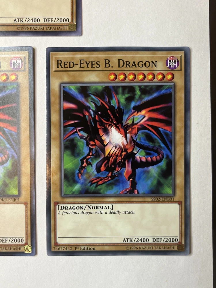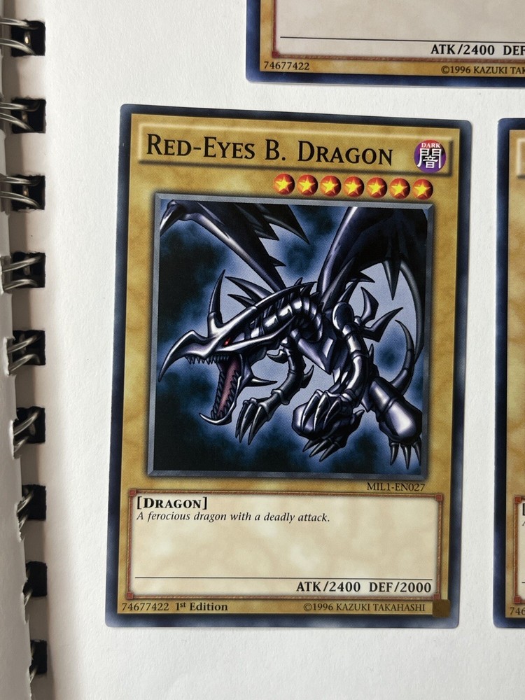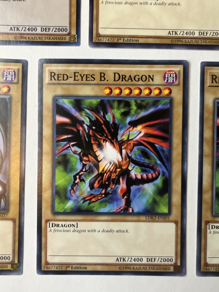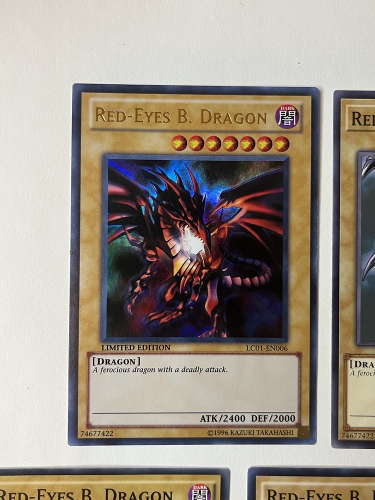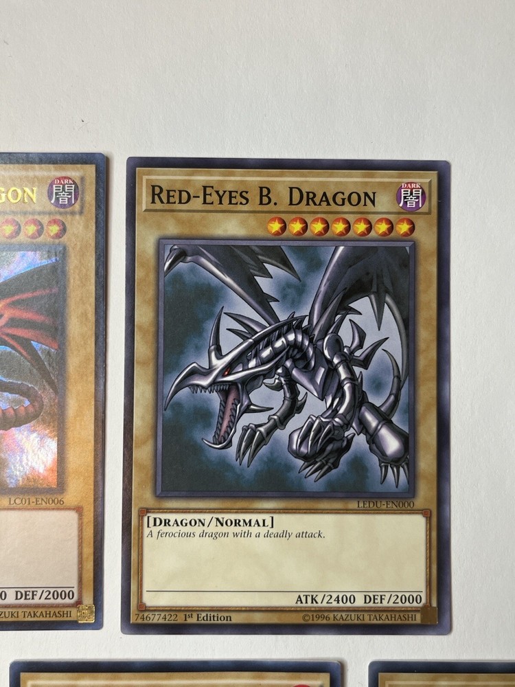 This YuGiOh! card set includes: Red Eyes B. Dragon LC01-EN006 Ultra Rare Red Eyes B. Dragon LEDU-EN000 1st Edition Red Eyes B. Dragon MIL1-EN027 1st Edition Red Eyes B. Dragon LDK2-ENJ01 1st Edition Red Eyes B. Dragon SS02-ENB01 1st Edition All cards are in NM condition, and come with a protective sleeve.