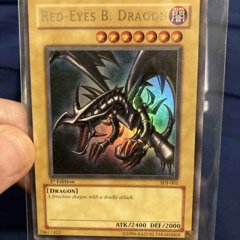 Hi. Up for sale is a 1st edition Red-Eyes B. Dragon card numbered SDJ-001. Card is in fantastic shape overall. The holo and front of the card appears to be nearly immaculate. It would display very well. The back seems to have no visible scratches either. The only thing that might keep this card from being mint is the light wear on the back right edge of the card (could just be how the card was made or cut?) Thanks for looking and feel free to ask a question or for more pictures.