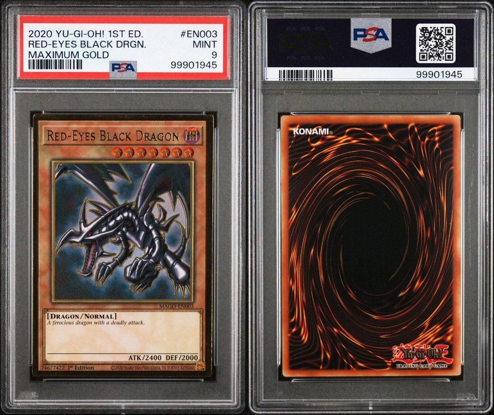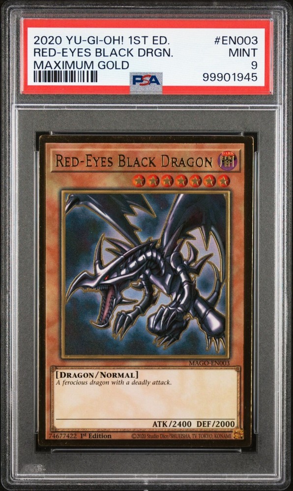 9This is a rare and highly sought-after Yu-Gi-Oh! card featuring the iconic Red-Eyes Black Dragon. It comes from the Maximum Gold set and has a premium gold rare finish. The card is made of high-quality card stock and has a holographic design. The card is in excellent shape and has been graded a PSA 9 Mint, ensuring its authenticity and value. It is perfect for collectors and fans of the Yu-Gi-Oh! TCG game. The card number is MAGO-EN003 and it was manufactured by Konami in the United States in 2020. This standard-sized card is in English language and has no autograph. Get your hands on this amazing card today!