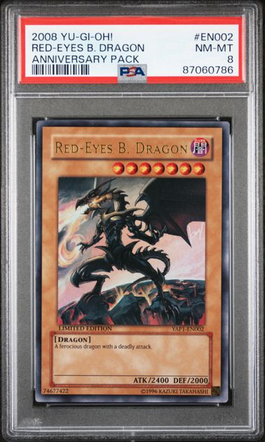 Description You are purchasing the item(s) listed in the table below. Shipping Unless stated otherwise, free shipping. All cards are shipped in a bubble mailer. All items are shipped within 24 hours. Weekends do not count as business days. All orders made on Fridays after 8AM EST and weekends will be shipped on the following Monday. International Shipping Only ship to eligible countries under the GSP (Global Shipping Program). Buyers are responsible for all international shipping fees. For more information, go to this link [http://pages.ebay.com/help/buy/shipping-globally.html] No Returns Quantity Name 1 Red-Eyes Black Dragon Anniversary Pack Ultra Rare YAP1-EN002 PSA 8