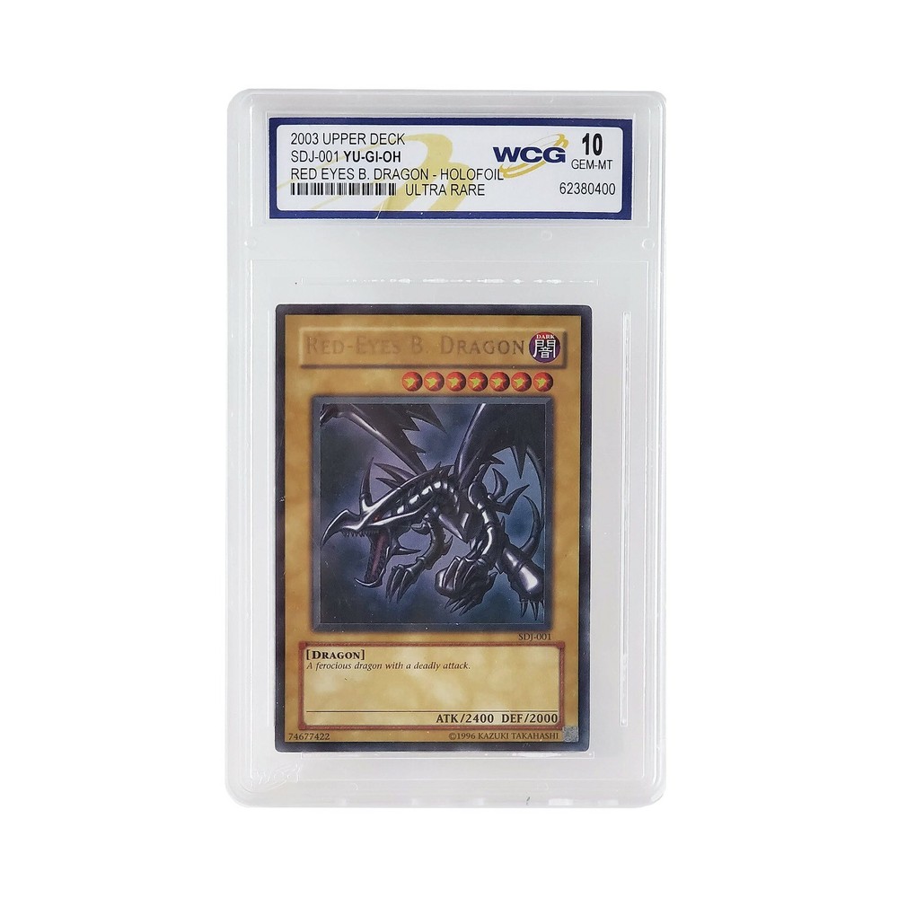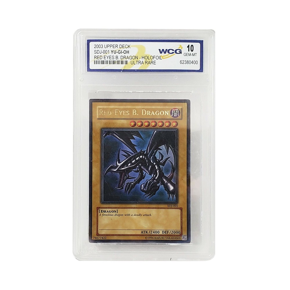 Red-Eyes Black Dragon 2003 Starter Deck: Joey (SDJ) #001 World Class Grader GEM 10 Mint ▸Ultra Rare ▸Holofoil Finish ▸Pre-owned The card has been professionally graded by WCG, and while the card is Mint, the case has some damage - most noticeably scuffing on the back*, and a scratch by the SKU bar. Photos show the card with various lighting angles to show off holofoil effects. *Scuffing on the back is much less noticeable when not under studio lighting.