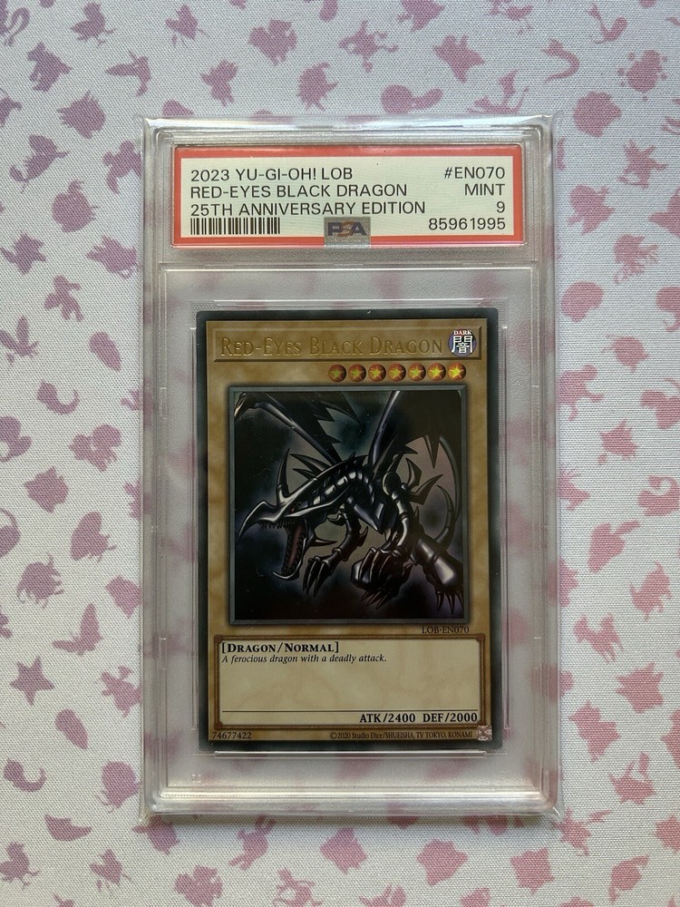 This is a rare and highly sought-after Yu-Gi-Oh! card featuring the iconic Red-Eyes Black Dragon. It comes from the Legend of Blue Eyes White Dragon set and has an ultra-rare rarity. The card is a standard size with a holographic finish and is in English language. The card is graded and has a PSA 9 rating. It is an anniversary reprint and has the card number LOB-EN070. The card is an effect type and belongs to the Dragon creature/monster type. It was manufactured by Konami in 2023 and is suitable for children aged 6+. The card is not autographed and is perfect for collectors of CCG individual cards and collectables.