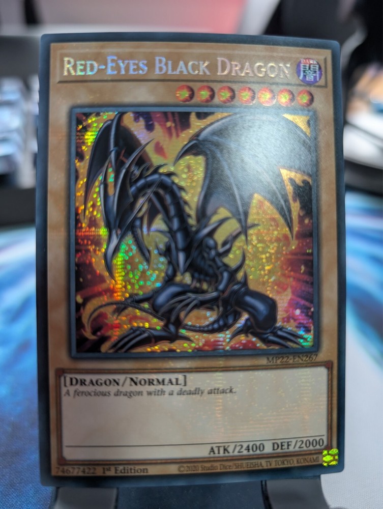 This YuGiOh! Red-Eyes Black Dragon is absolutely stunning—the Prismatic Secret Rare finish makes it pop with vibrant colors! The card arrived in perfect condition, packed securely to prevent any damage. A must-have for collectors and duelists alike, especially with the 1st Edition stamp. Super happy with this purchase!