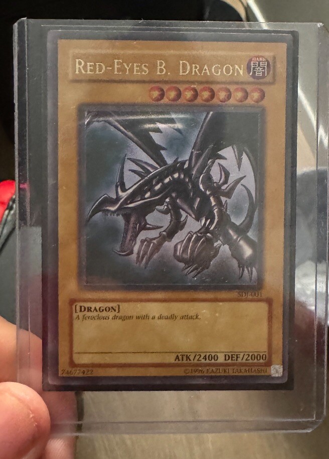 iconic Red-Eyes Black Dragon card (SDJ-001). As a standout piece from the original Joey Wheeler Starter Deck, this card holds significant value and nostalgic appeal for any collector and fan of the series. Card Details: Set: Starter Deck Joey Wheeler (SDJ-001) Card Number: SDJ-001 Type: Rare Condition: Excellent, stored in a protective sleeve within a binder The Red-Eyes Black Dragon is a legendary card that played a crucial role in the Yu-Gi-Oh! TV show, assisting both Joey Wheeler and Yugi Moto in countless duels. This specific version from Joey’s starter deck is especially rare and highly sought after. Why This Card Is Special: Iconic Status: As a key card from Joey Wheeler's original deck, Red-Eyes Black Dragon is one of the most recognizable and revered monsters in Yu-Gi-Oh! lore. Unique Origin: This card is from the original SDJ-001 deck, making it a rare and collectible item that few have in pristine condition. Condition: This card has been meticulously preserved in a protective sleeve and binder, with no visible marks or bends. Its condition suggests it has the potential for a very high grade if graded. Market Value: Ungraded versions of this card have sold for upwards of $1,000. Its rarity and condition contribute to its significant market value, with prices remaining consistently high over the years. Personal Significance: This card is my second favorite in my entire collection and holds a special place in my heart. It has served me well in many tournaments and was a cherished gift from my mom, adding to its sentimental value. Supporting a Special Cause: As I prepare for a significant personal milestone—my wedding—I am willing to part with this treasured card. While it holds immense personal value, I hope to see it go to a good home and serve a meaningful cause. Your purchase will not only secure a rare and valuable card but also support a special celebration in my life. Thank you for considering this rare Red-Eyes Black Dragon card. Your support is deeply appreciated and helps make my wedding celebration even more special.