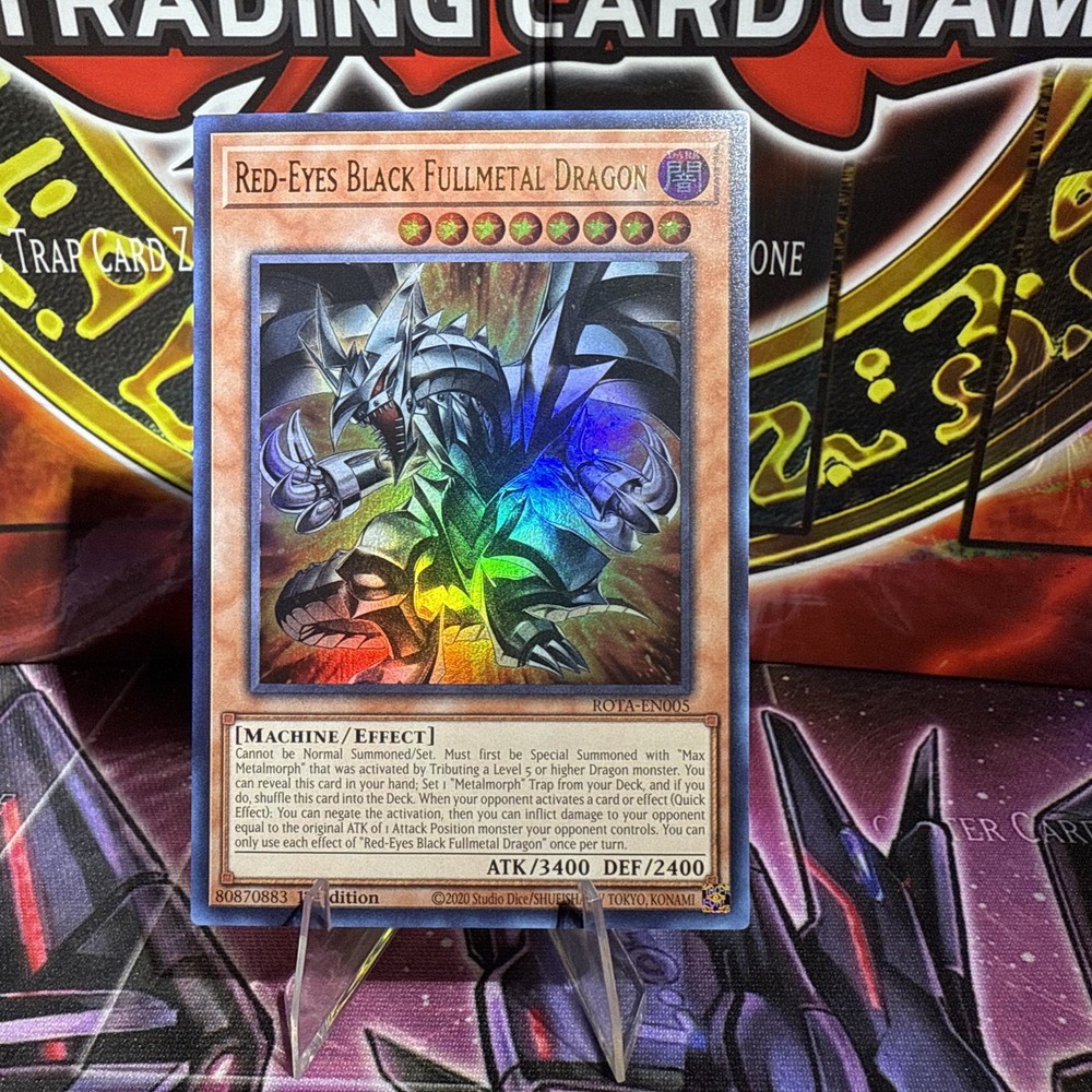 The Yu-Gi-Oh! Red-Eyes Black Fullmetal Dragon card from the Rage of the Abyss set is an Ultra Rare collectible card in English. This Effect card features the iconic Red-Eyes Black Fullmetal Dragon design, highly sought after by collectors and players alike in the Yu-Gi-Oh! TCG. With a near mint or better condition, this card is a valuable addition to any card collection and is sure to be a prized possession for fans of the game.