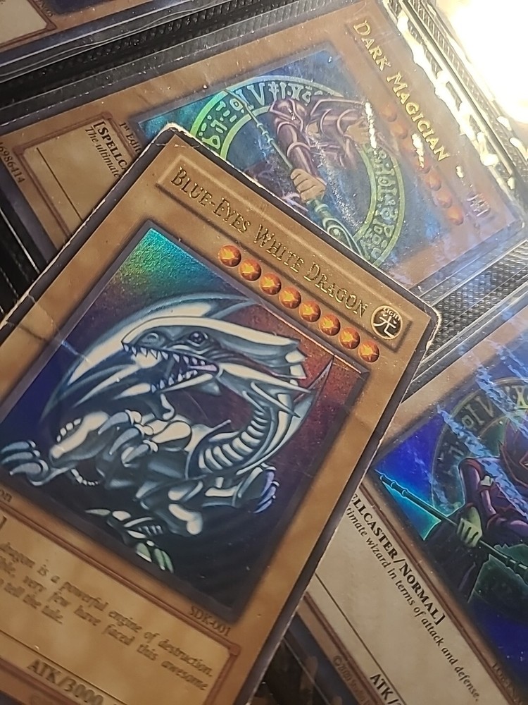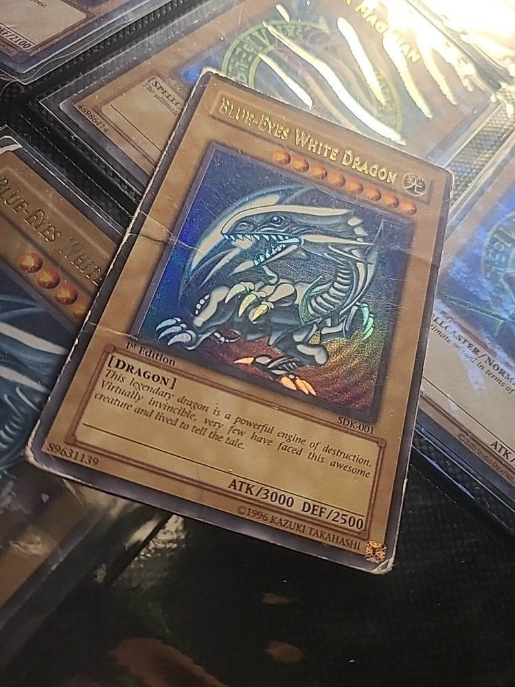 This Yu-Gi-Oh! TCG card is the legendary Blue Eyes White Dragon, made of paperboard material and manufactured by Konami in Japan in 2001. It is an Ultra Rare card with a 1st Edition and a Vintage finish, making it a highly sought-after collectible. The card features the iconic Blue Eyes White Dragon character and has a card number of SDK-001. The card is perfect for collectors and fans of the Yu-Gi-Oh! TCG game. It has a defense/toughness of 2500 and an attack/power of 3000, making it a formidable monster card. The card is in Asian English and has a finish of foil. It belongs to the Attribute/MTG:Color of Light and Creature/Monster Type of Normal. The card is suitable for players aged 4+ and is a great addition to any collection.