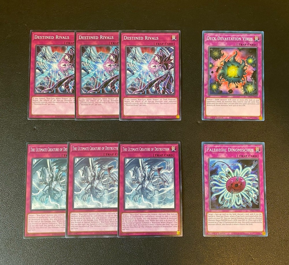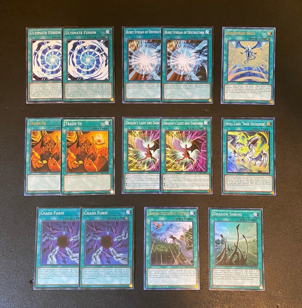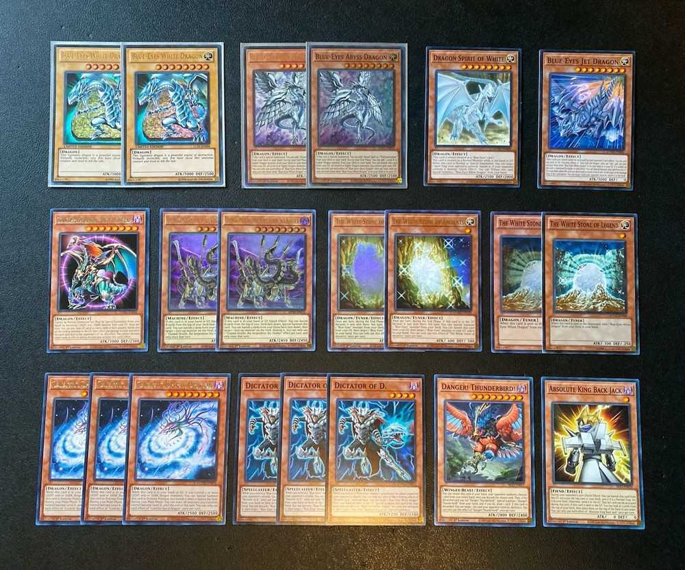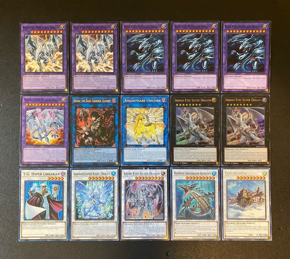 Yugioh Seto Kaiba Blue-Eyes White Dragon Deck. Everything is Near Mint but Azure-Eyes Silver Dragon. It has a very small dent on the top of the card. You can see it circled in the picture above. Extra Deck: 3x Blue-Eyes Ultimate Dragon - Common 2x Blue-Eyes Twin Burst Dragon - Common 1x Neo Blue-Eyes Ultimate Dragon - Common 1x Adamancipator Risen - Dragite - Common 1x Cloudcastle - Rare 1x Knightmare Unicorn - Rare 1x Ravenous Crocodragon Archethys - Common 1x T.G. Hyper Librarian - Common 1x Azure-Eyes Silver Dragon - Common 2x Indigo-Eyes Silver Dragon - Ultra Rare 1x Dharc The Dark Charmer, Gloomy - Ultra Rare Monsters: 2x Blue-Eyes White Dragon - Ultra Rare 1x Blue-Eyes Jet Dragon - Common 1x Dragon Spirit of White - Common 3x Dictator of D. - Common 2x Gizmek Orochi, The Sepentron Sky Blaster - Ultra Rare 1x Chaos Emperor Dragon - Envoy of The End - Rare 2x The White Stone of Ancients - 1 Ultra Rare + 1 Rare 2x The White Stone of Legend - Common + 1 Super Rare 2x Blue-Eyes Abyss Dragon - 1 Super Rare + 1 Platinum Rare 1x Danger! Thunderbird! - Common 1x Absolute King Back Jack - Common 3x Galactic Spiral Dragon - Rare Spells: 2x Trade-In - 1 Common + 1 Rare 2x Ultimate Fusion - Common 2x Chaos Form - Common 2x Burst Stream of Destruction - Common 2x Dragon’s light and Darkness - Common 1x Successor Soul - Ultra Rare 1x Dragon Shine - Super Rare 1x Danger! Excitement! Mystery! - Rare 1x Spell Card “Soul Exchange” - Super Rare Traps: 1x Deck Devastation Virus - Common 1x Paleozoic Dinomischus - Common 3x Destined Rivals - Common 3x The Ultimate Creature of Destruction - Common